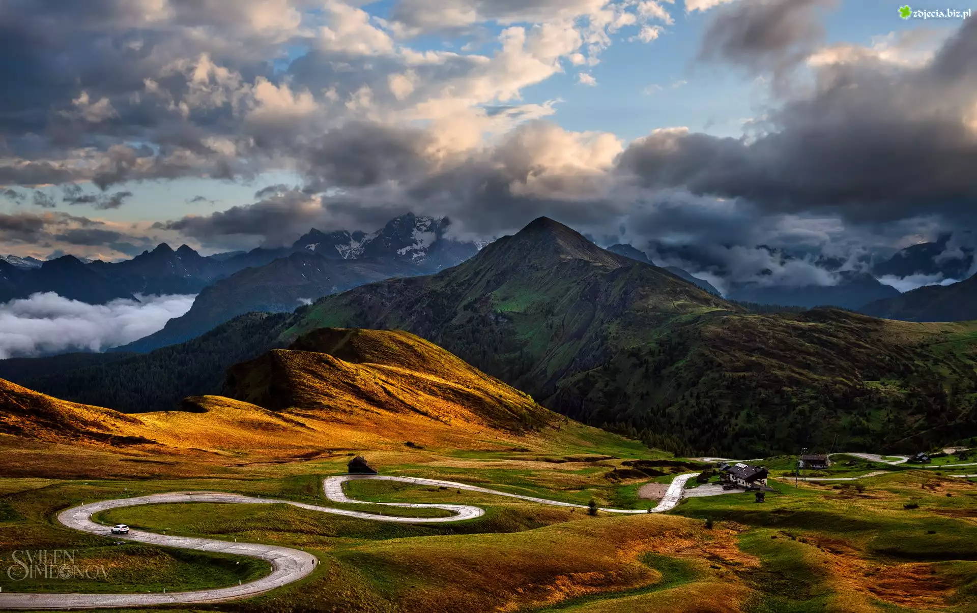 Góra, Jeziora, Wisona Las, Chmury Krajobraz, Góry, Chmury, Woda Balon, Łąka, Droga Droga, Rolls Royce, Góry Chmury, Przebijające, Promienie, Linia, Transmisyjna Jesień, Droga, Wieś Góry, Rzeka, Zachód, Słońca Droga, Ogrodzenie, Las Niebieskie, Niebo, Chmurki, Białe, Piórka Góry, Woda Góra, Zachód Słońca, Chmura Chmury, Zachód, Słońca, Purpuowe, Kwiatki Niebo, Obłoki
