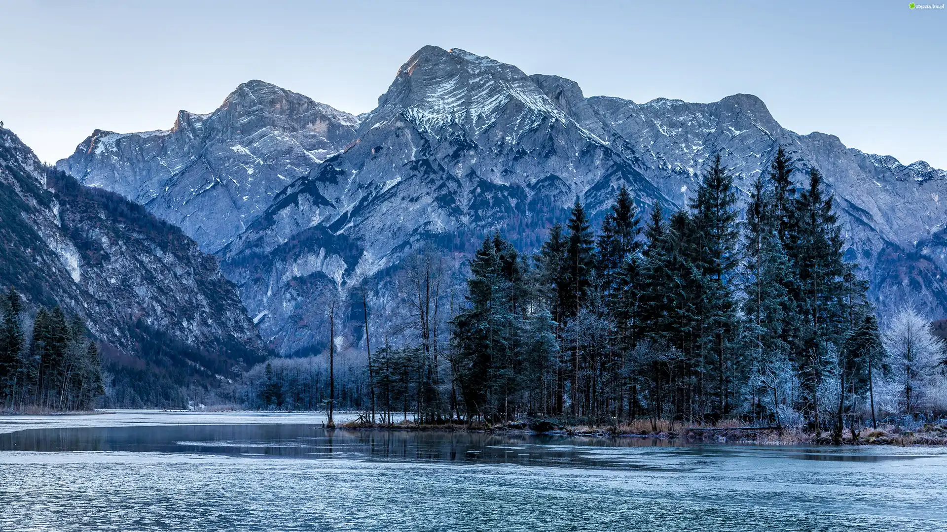Zdjęcie Austria, Góry Alpy, Dolina Almtal, Jezioro Almsee, Drzewa