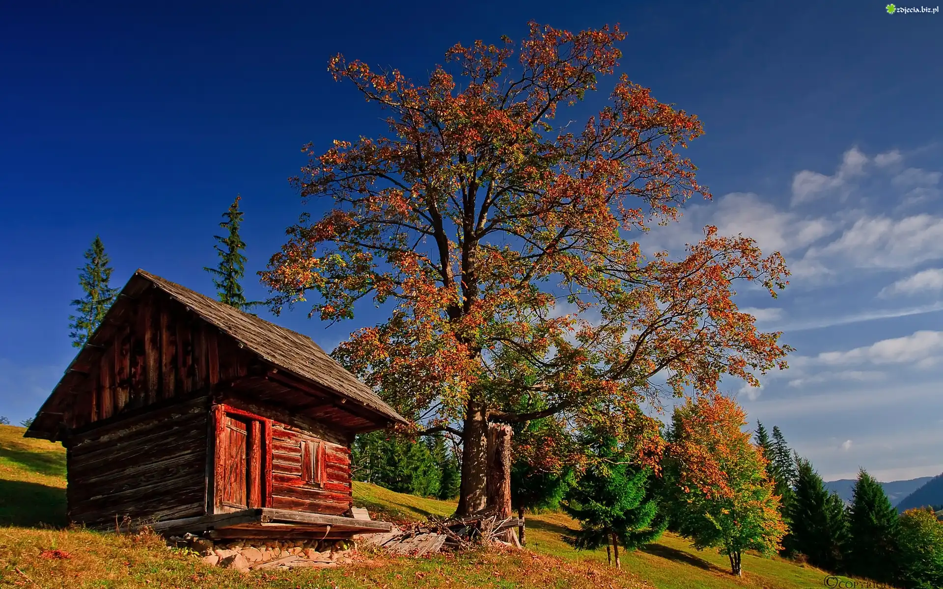 Zdjęcie Góry, Domek, Drzewa, Jesień