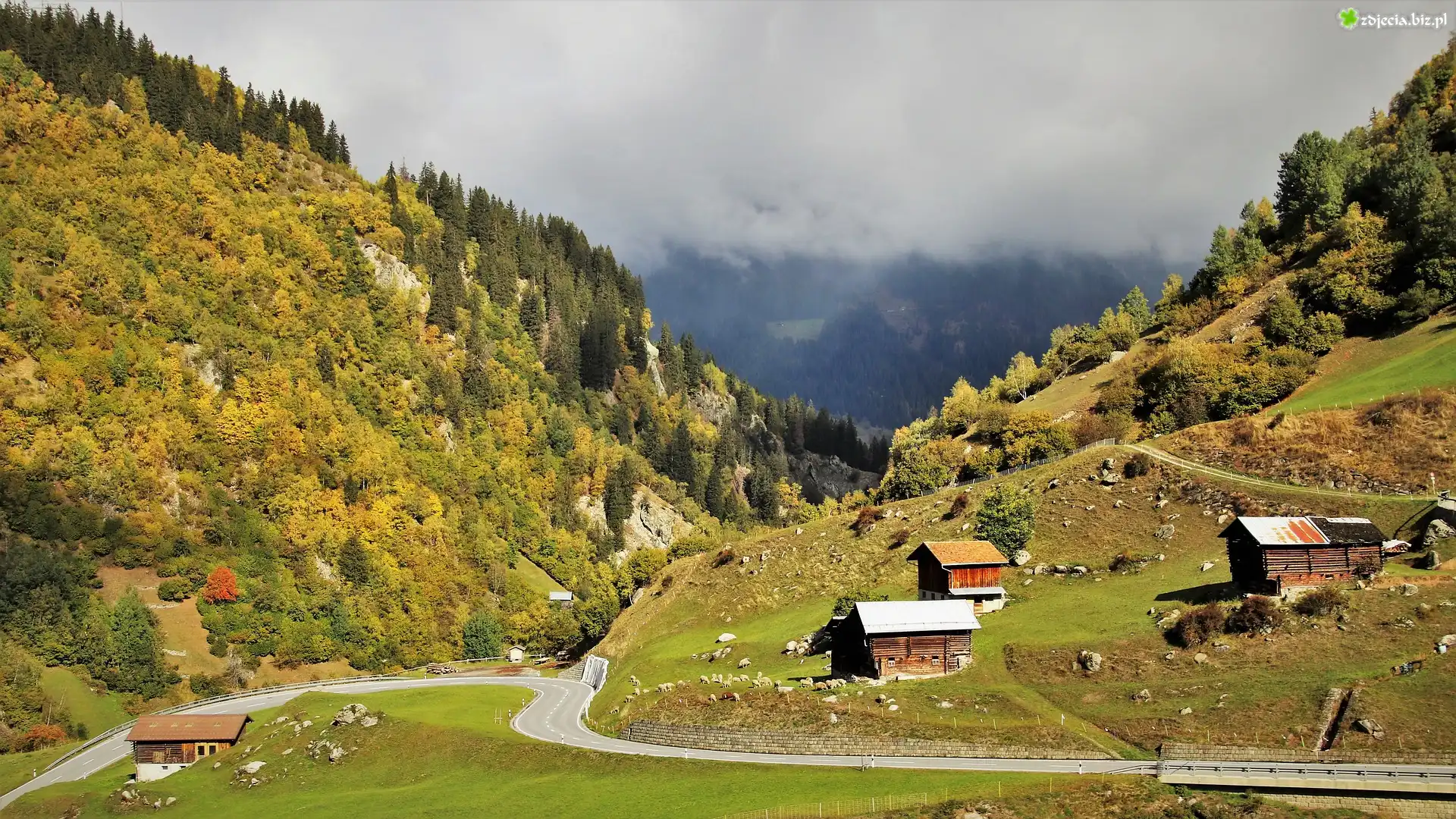 Zdjęcie Góry, Drewniane, Domki, Droga, Drzewa, Niebo