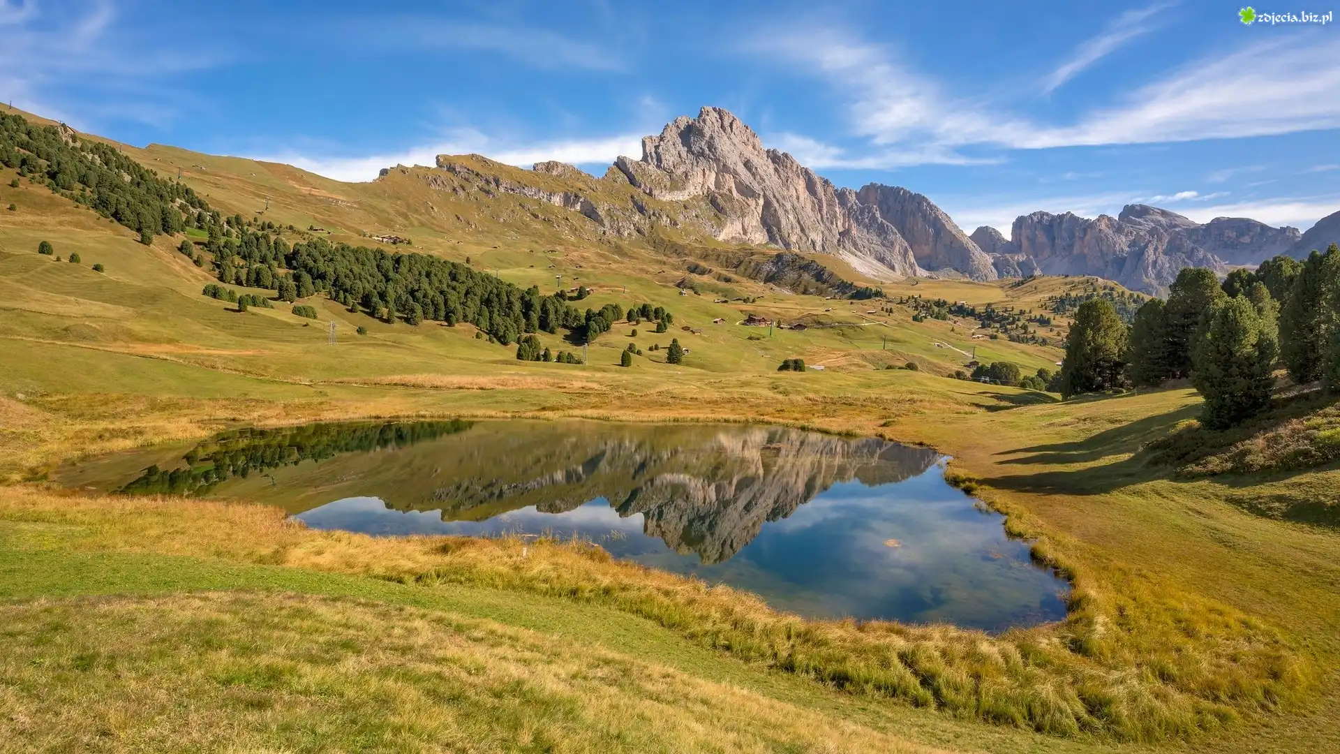Zdjęcie Góry, Dolomity, Jezioro Lech Sant, Drzewa, Łąka, Gmina Santa Cristina Val Gardena, Włochy