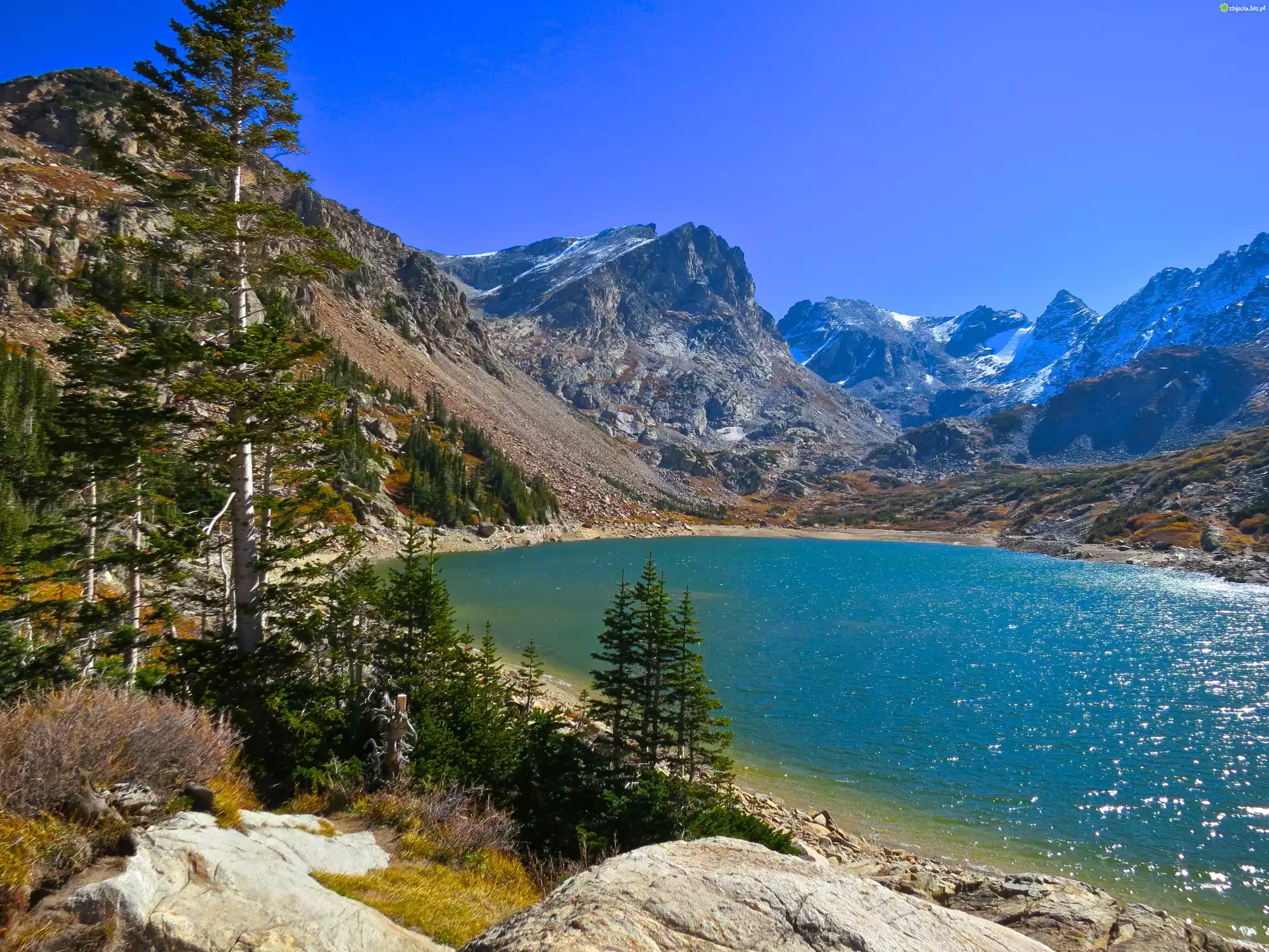 Zdjęcie Góry, Jezioro, Kamienie, Drzewa, Roślinność