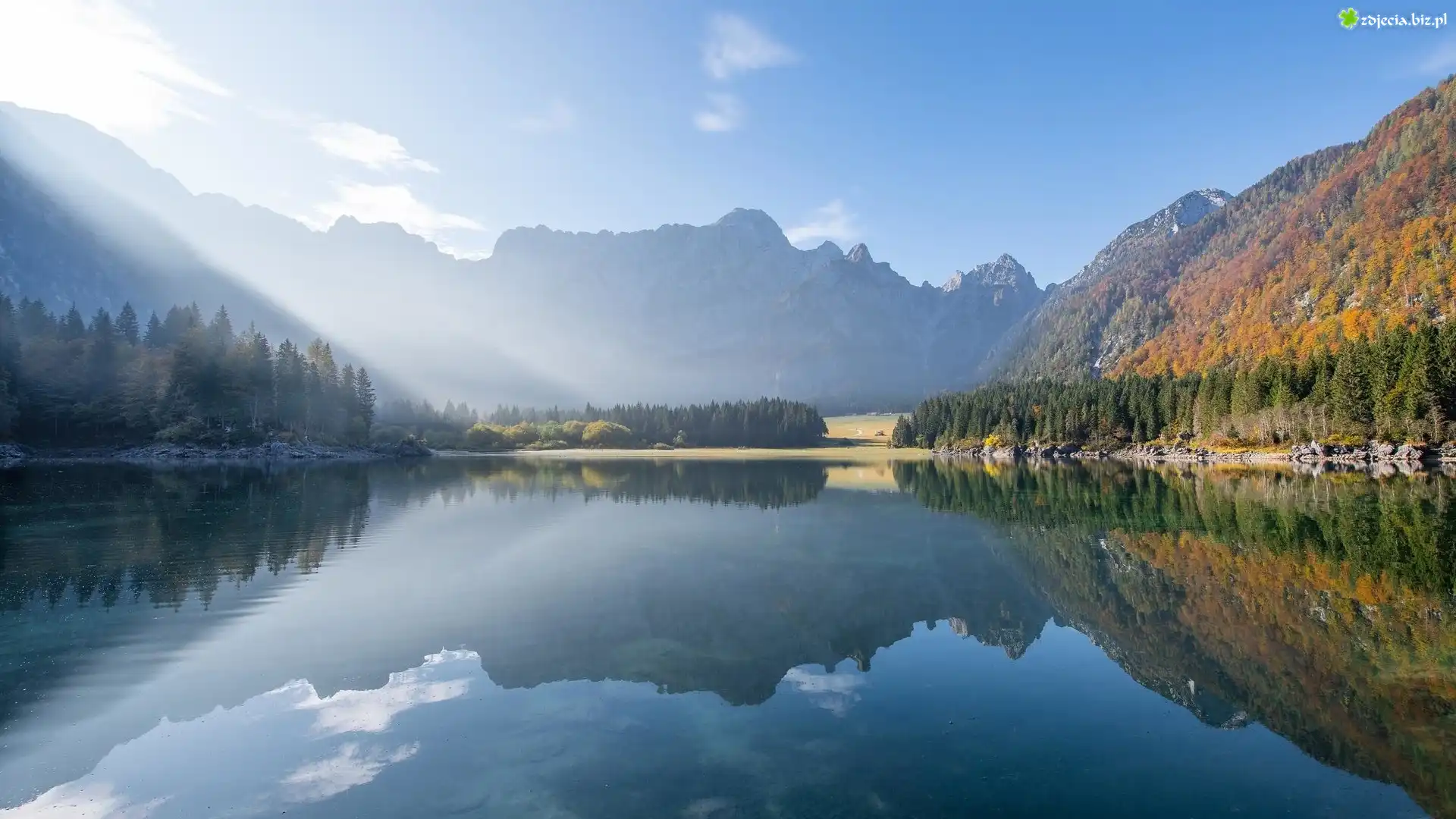 Zdjęcie Góry, Alpy Julijskie, Jezioro, Fusine Lake, Drzewa, Odbicie, Włochy