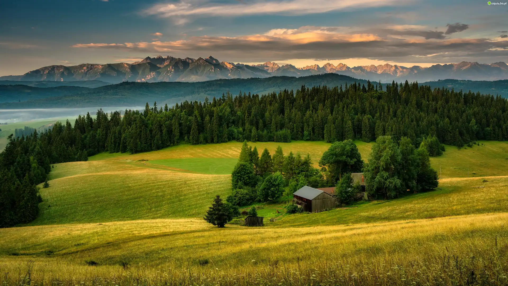 Zdjęcie Pole, Las, Drzewa, Góry, Wzgórza, Dom, Chmury, Pieniny, Polska