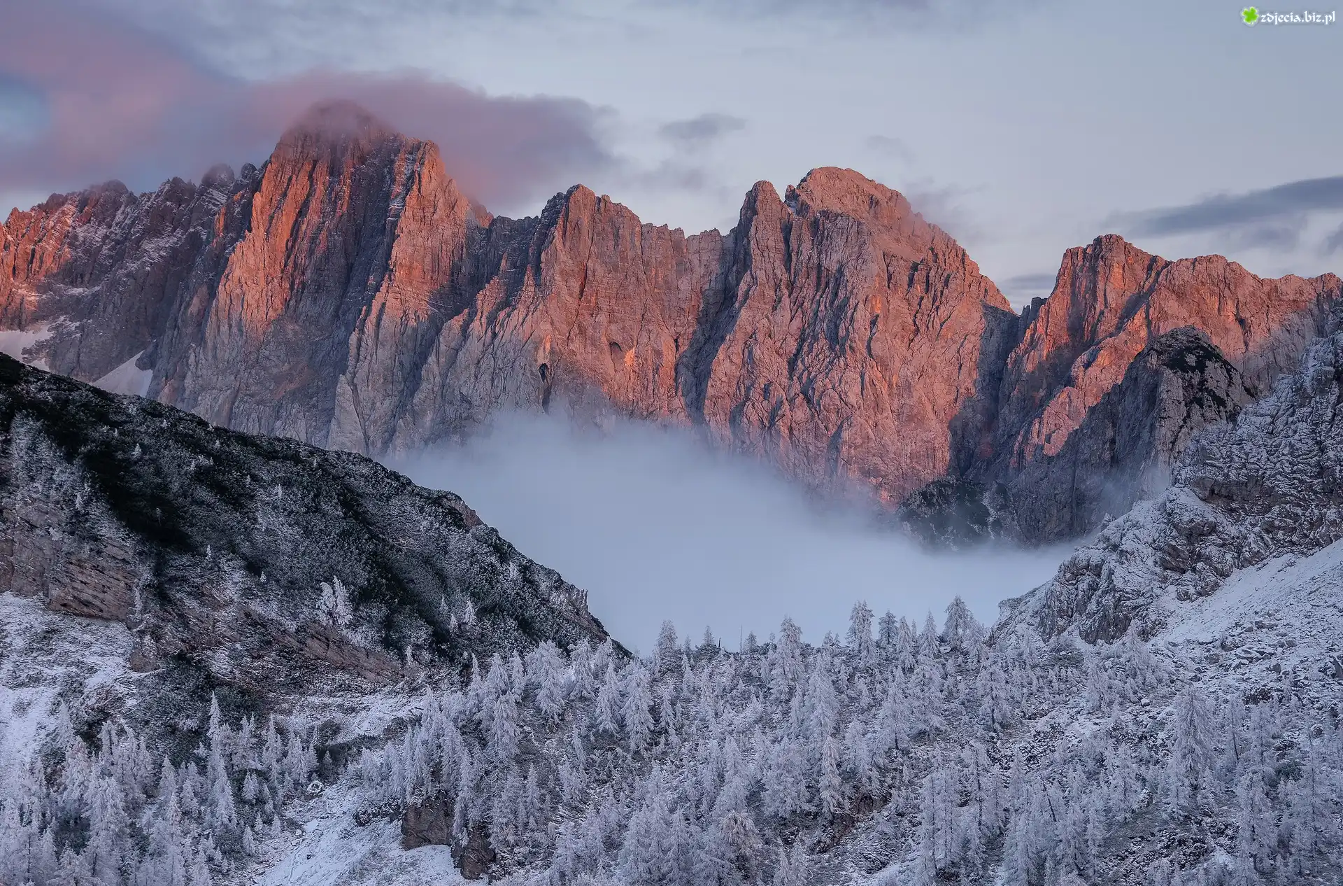 Zdjęcie Góry, Śnieg, Las, Drzewa, Mgła