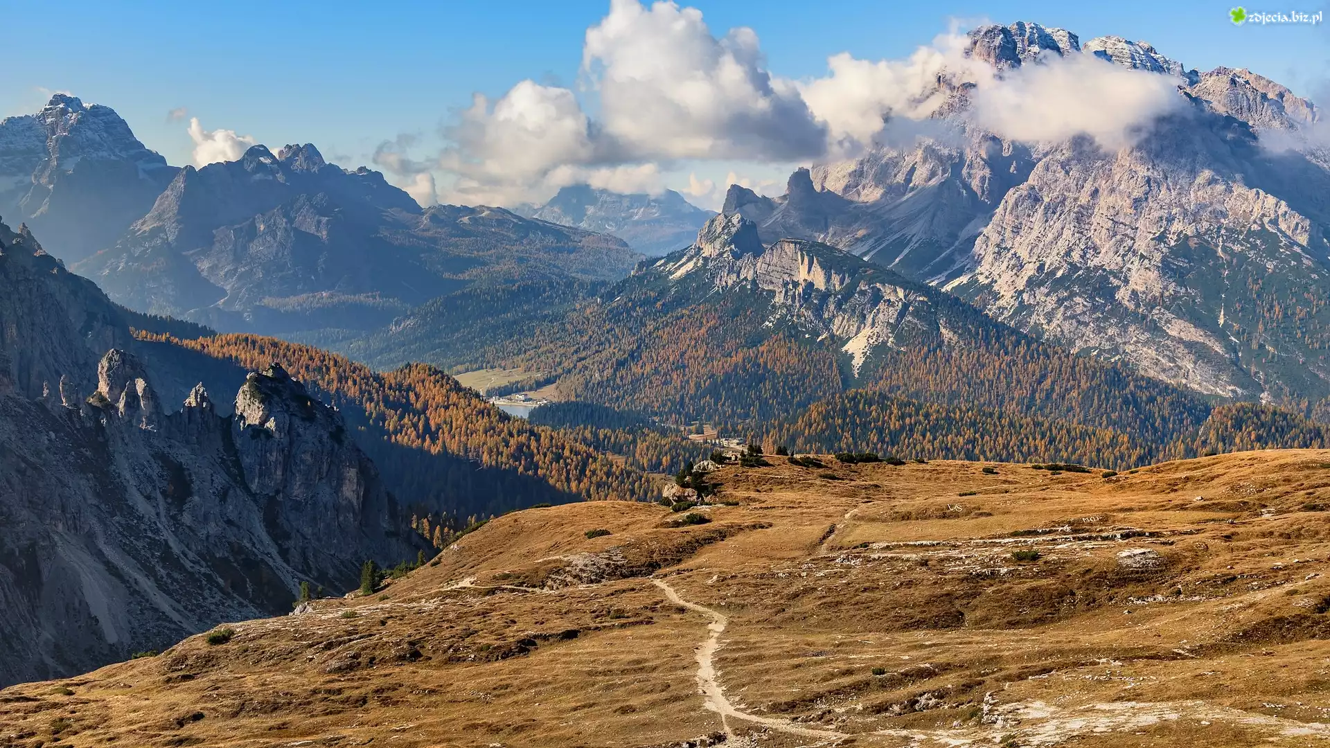 Zdjęcie Góry, Dolomity, Jezioro, Misurina Lake, Ścieżka, Drzewa, Chmury, Włochy