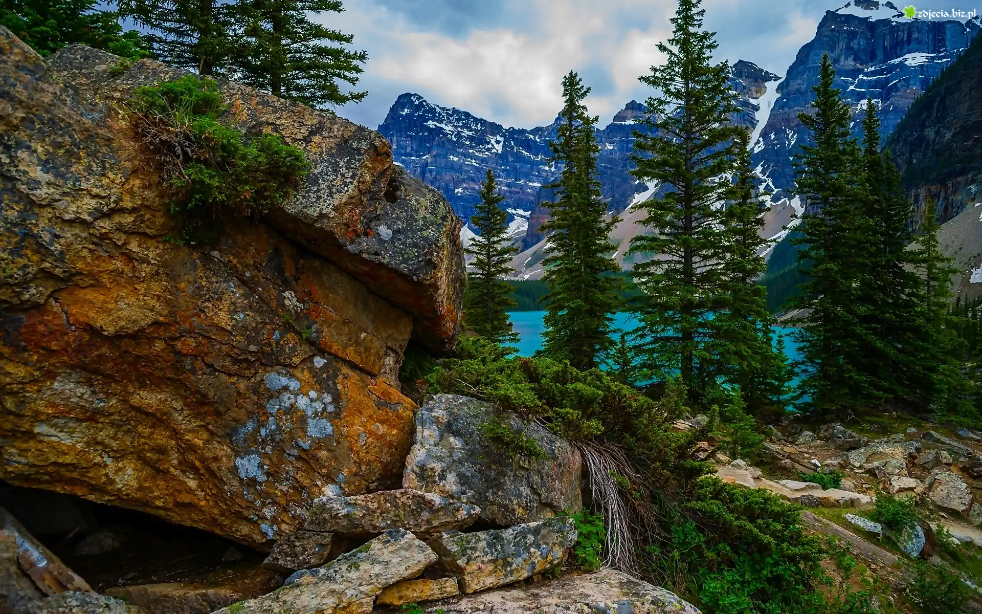 Zdjęcie Góry, Skały, Drzewa, Jezioro