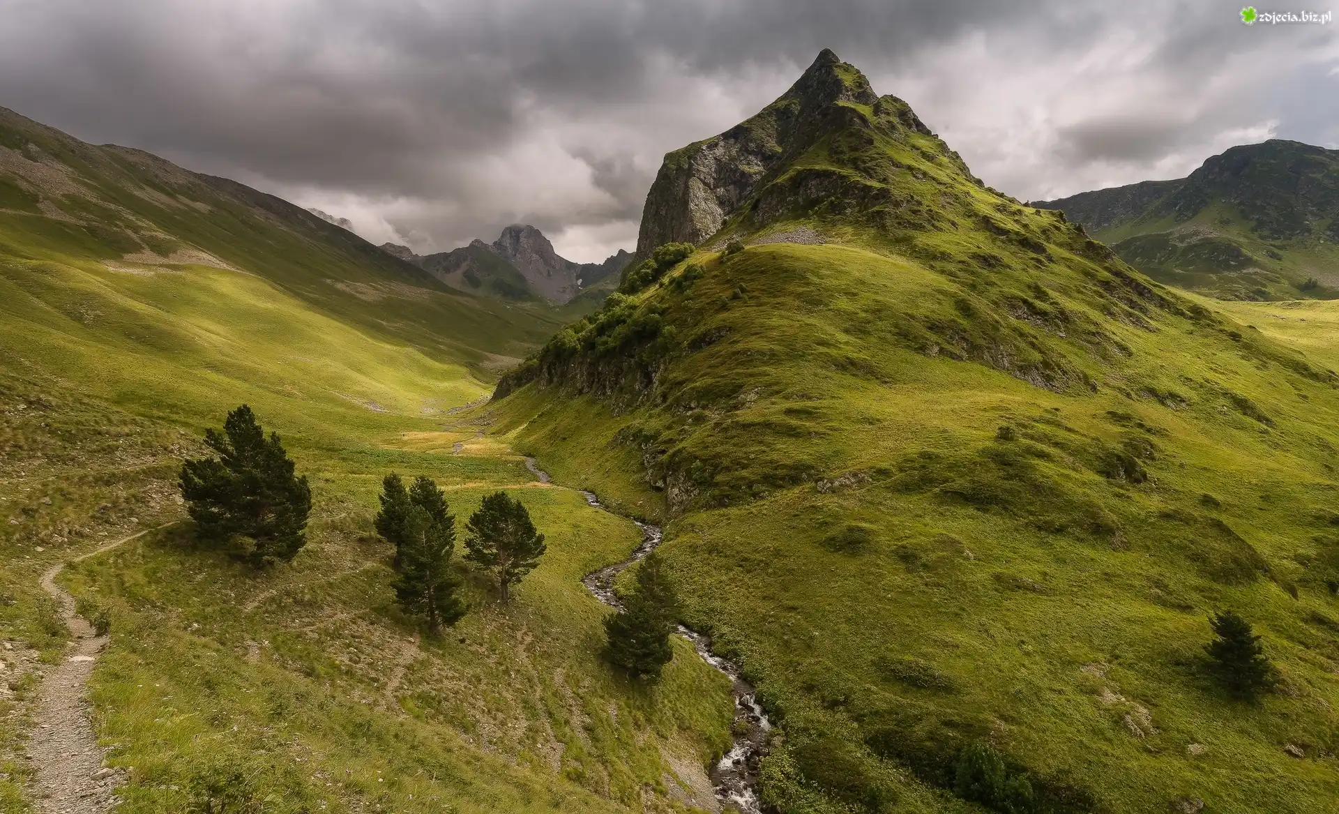 Zdjęcie Góry, Dolina, Strumyk, Ścieżka, Drzewa, Chmury