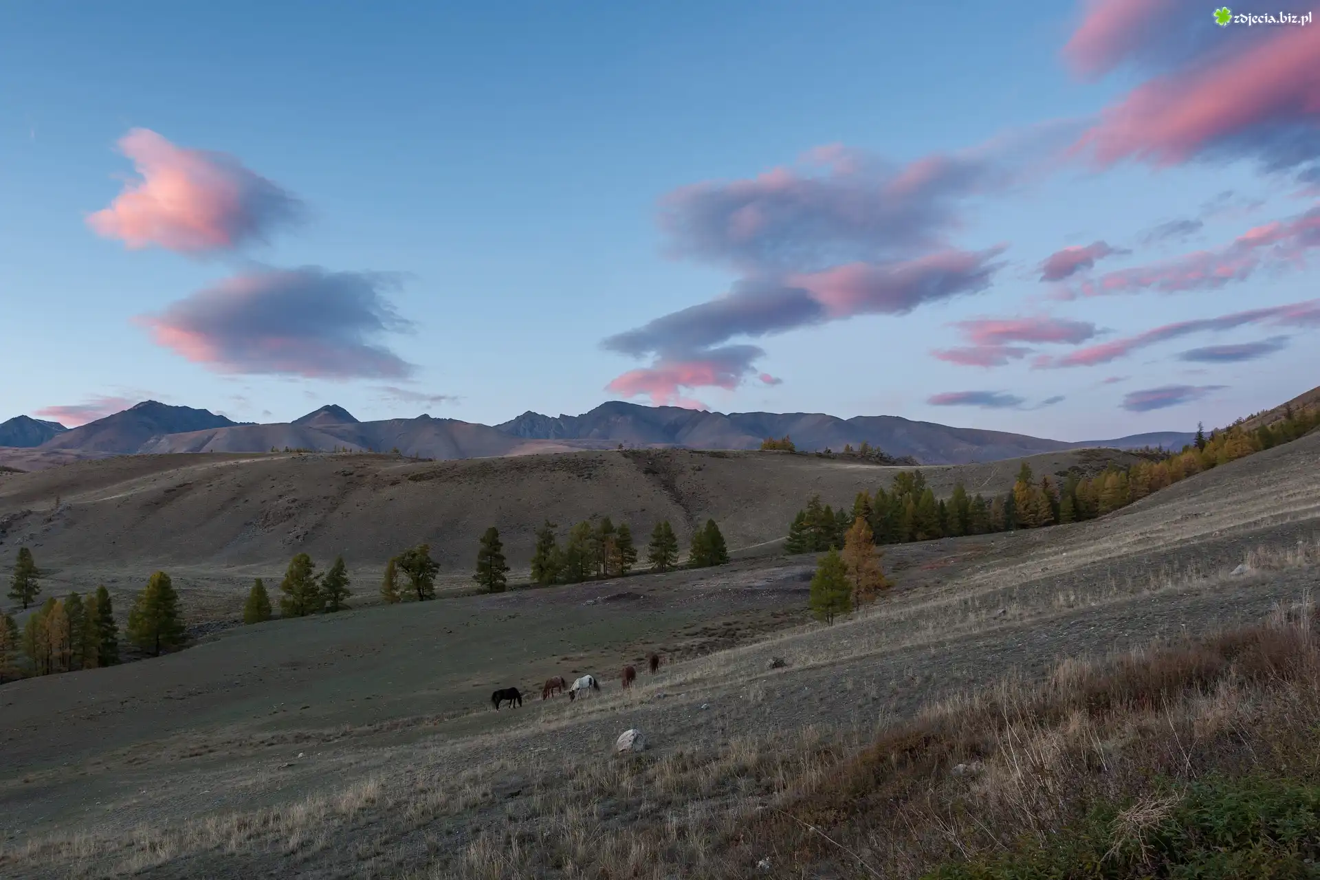 Zdjęcie Góry, Wzgórza, Drzewa, Konie