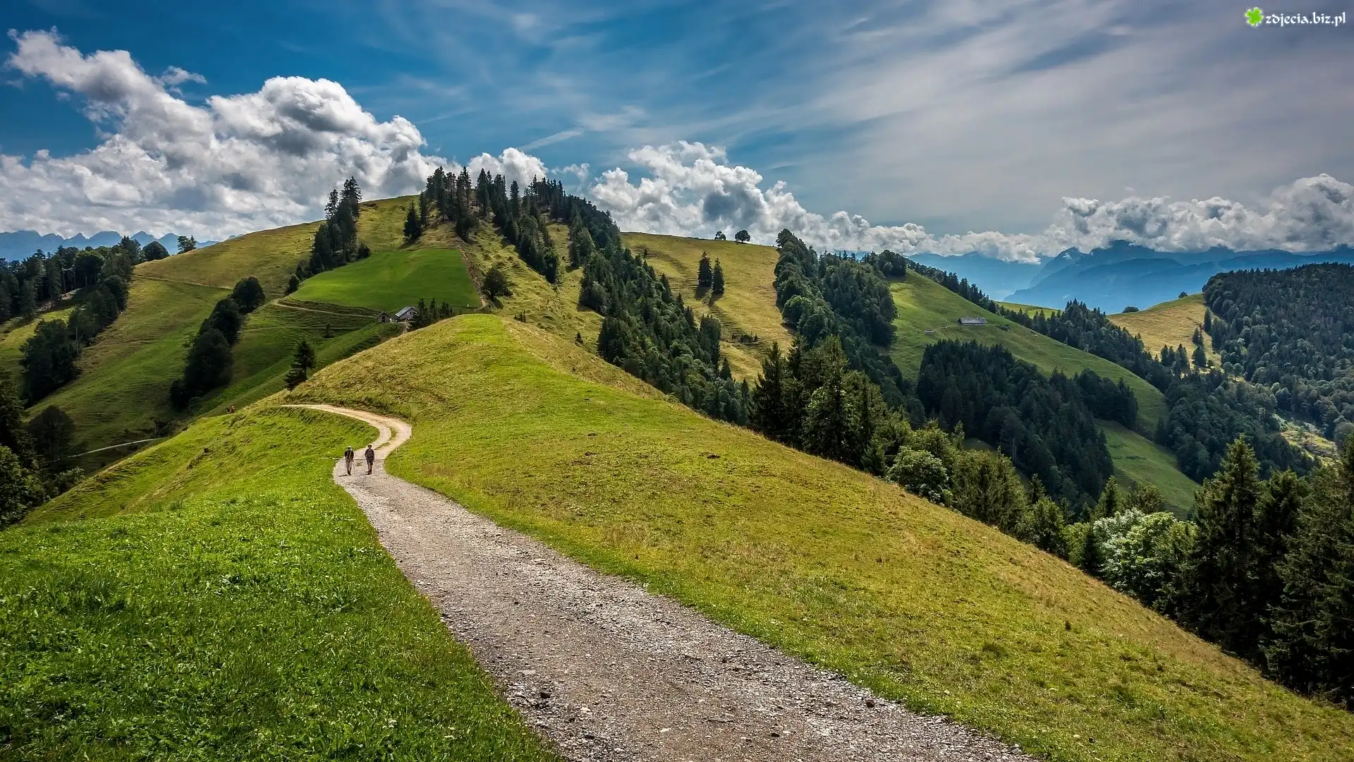 Zdjęcie Góry, Zielone, Wzgórze, Droga, Drzewa, Chmury