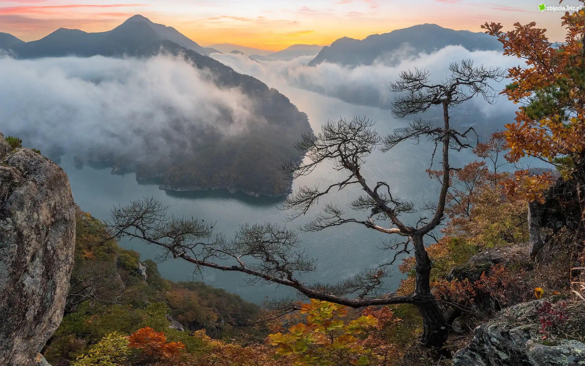 Zdjęcie Góry, Mgła, Jesień, Skały, Drzewo, Rzeka