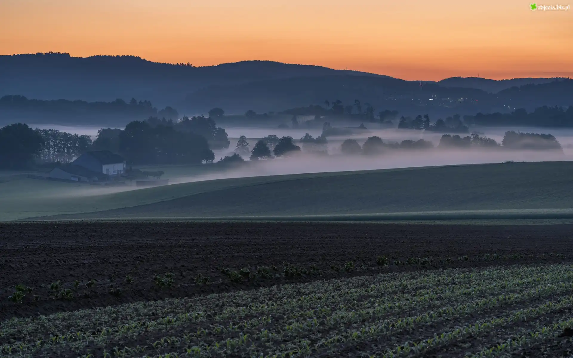 Zdjęcie Pola, Dolina, Drzewa, Mgła, Wschód słońca, Góry, Eifel, Nadrenia-Palatynat, Niemcy