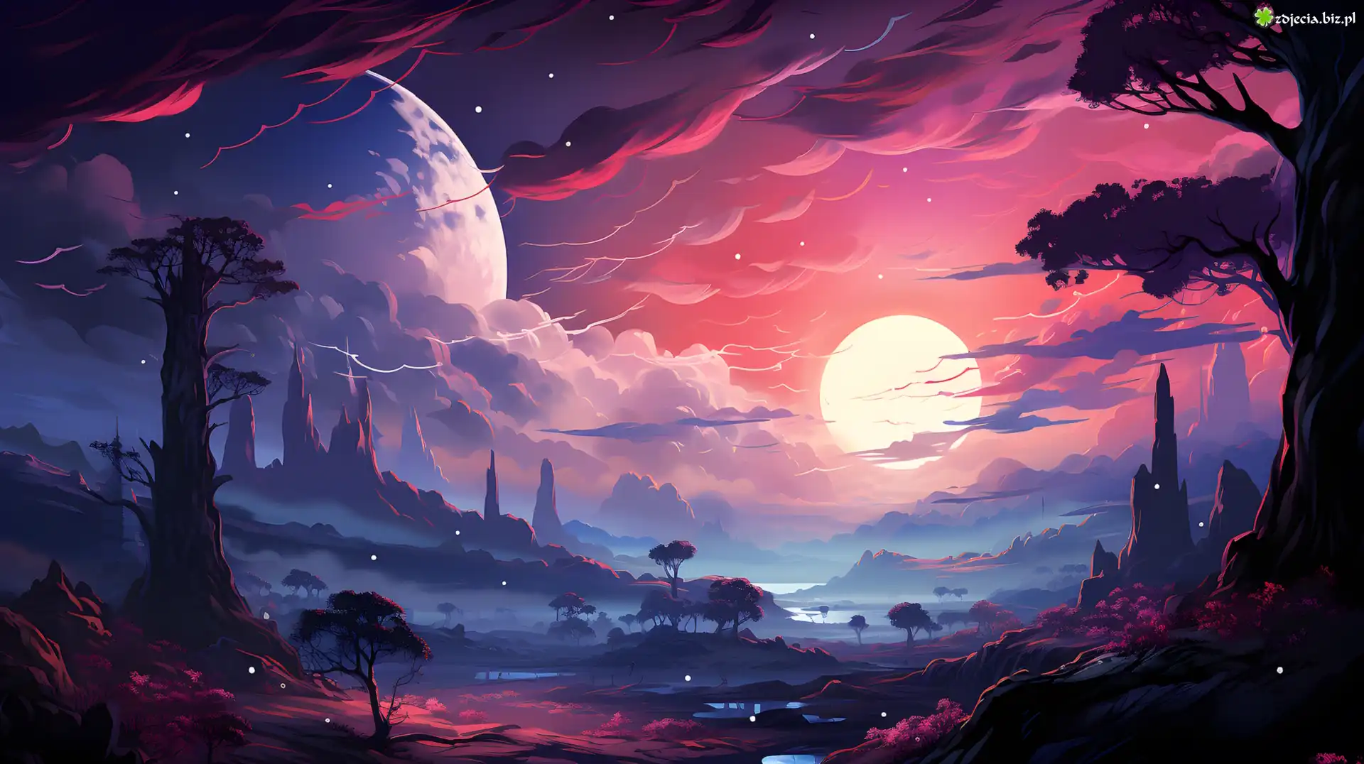 Zdjęcie Księżyc, Niebo, Chmury, Góry, Planeta, Fantasy