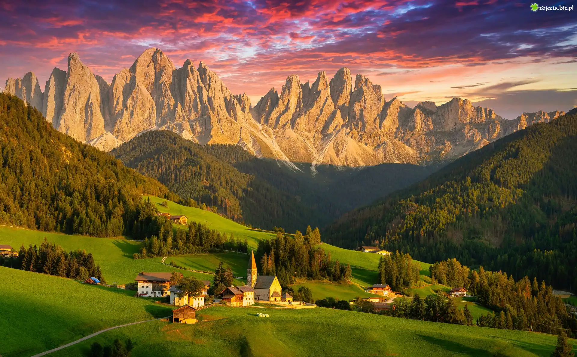 Zdjęcie Włochy, Dolina, Val di Funes, Wieś, Santa Maddalena, Góry, Dolomity, Lasy, Drzewa, Kościół Chmury |