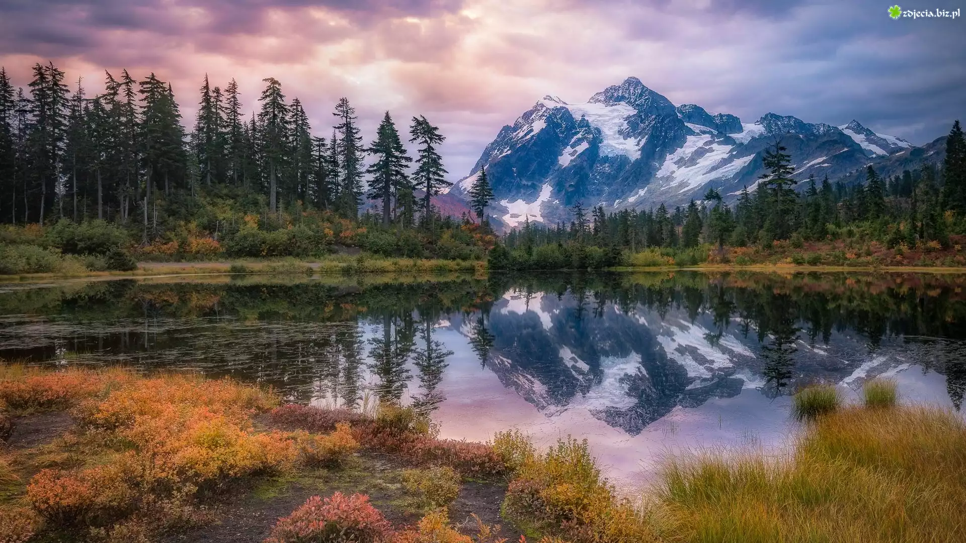 Zdjęcie Góry, Góra, Mount Shuksan Drzewa, Jezioro, Picture Lake, Odbicie, Stan Waszyngton, Stany Zjednoczone, Park Narodowy Północnych Gór Kaskadowych |
