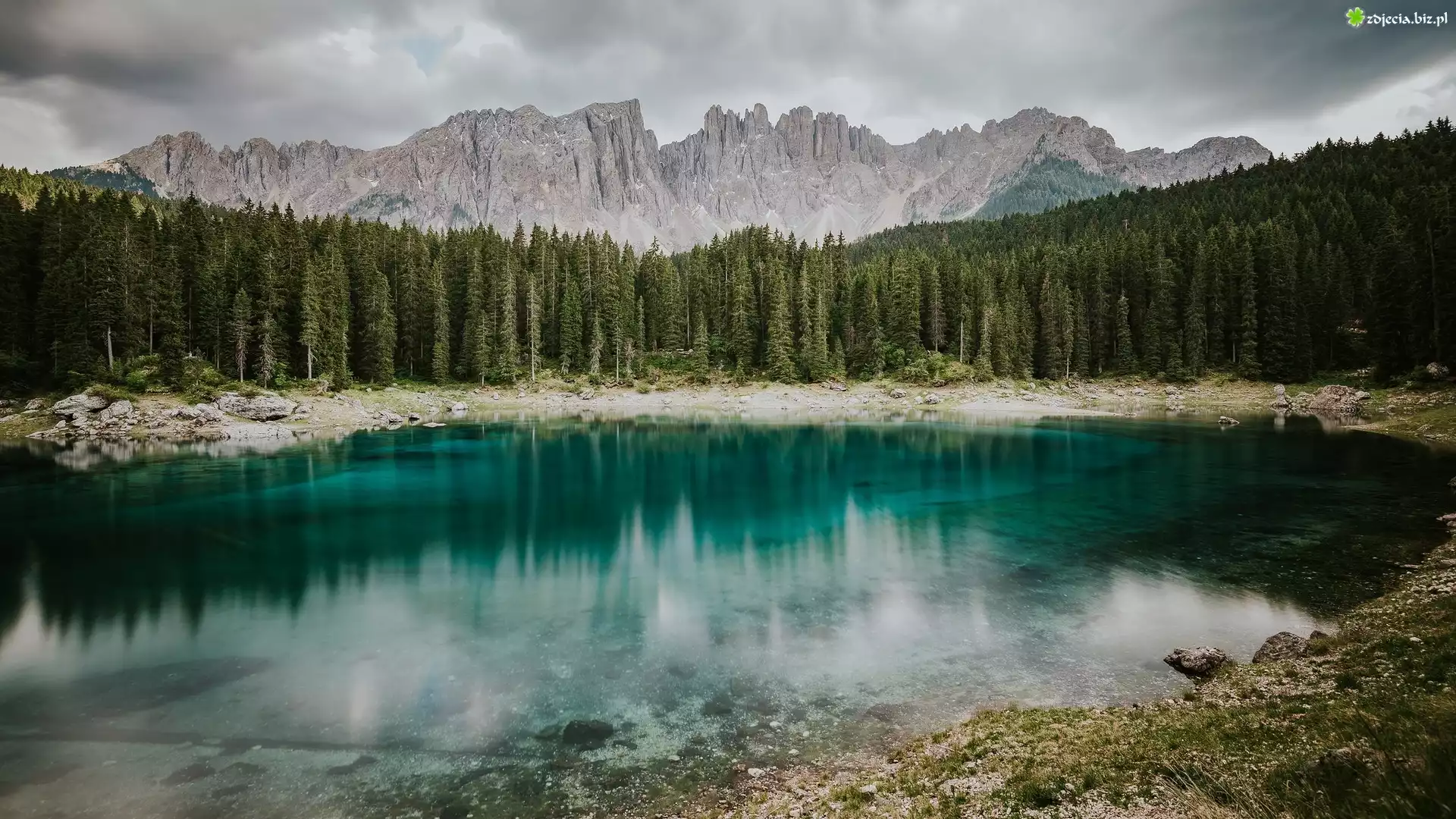 Zdjęcie, Jezioro Karersee, Góry Dolomity, Góra Latemar, Drzewa, Las, Miejscowość Welschnofen, Włochy