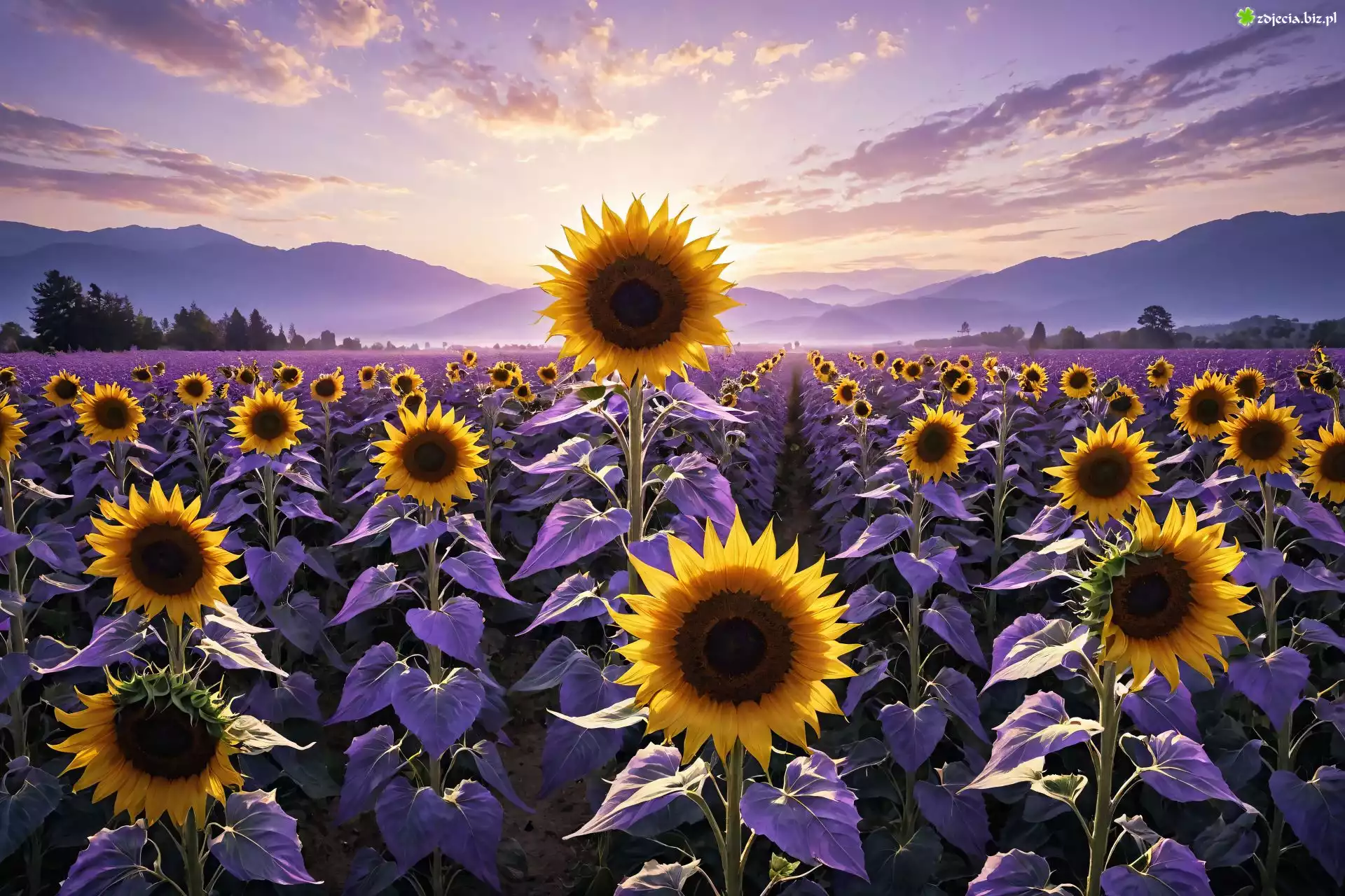 Zdjęcie Pole, Słoneczniki, Drzewa, Góry, Niebo, Grafika