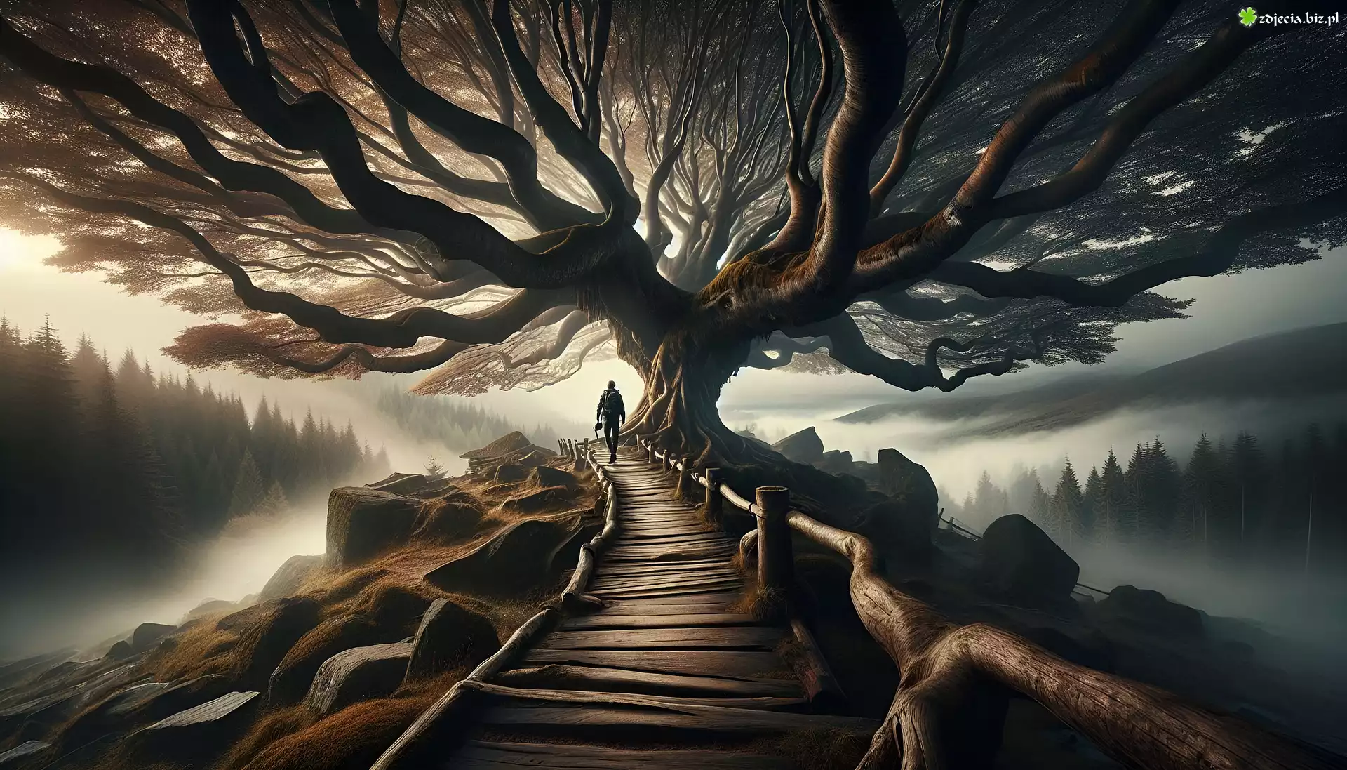 Zdjęcie Droga, Drzewo, Mgła, Góry, Człowiek, Grafika