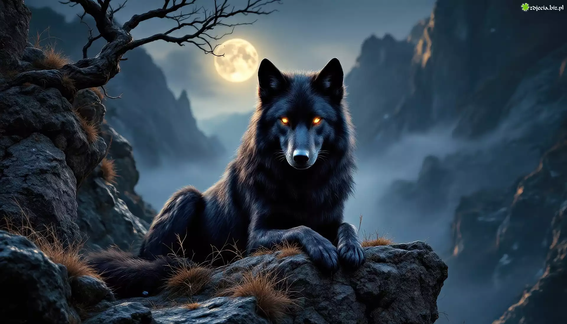Zdjęcie Czarny, Wilk, Skała, Góry, Księżyc, Grafika