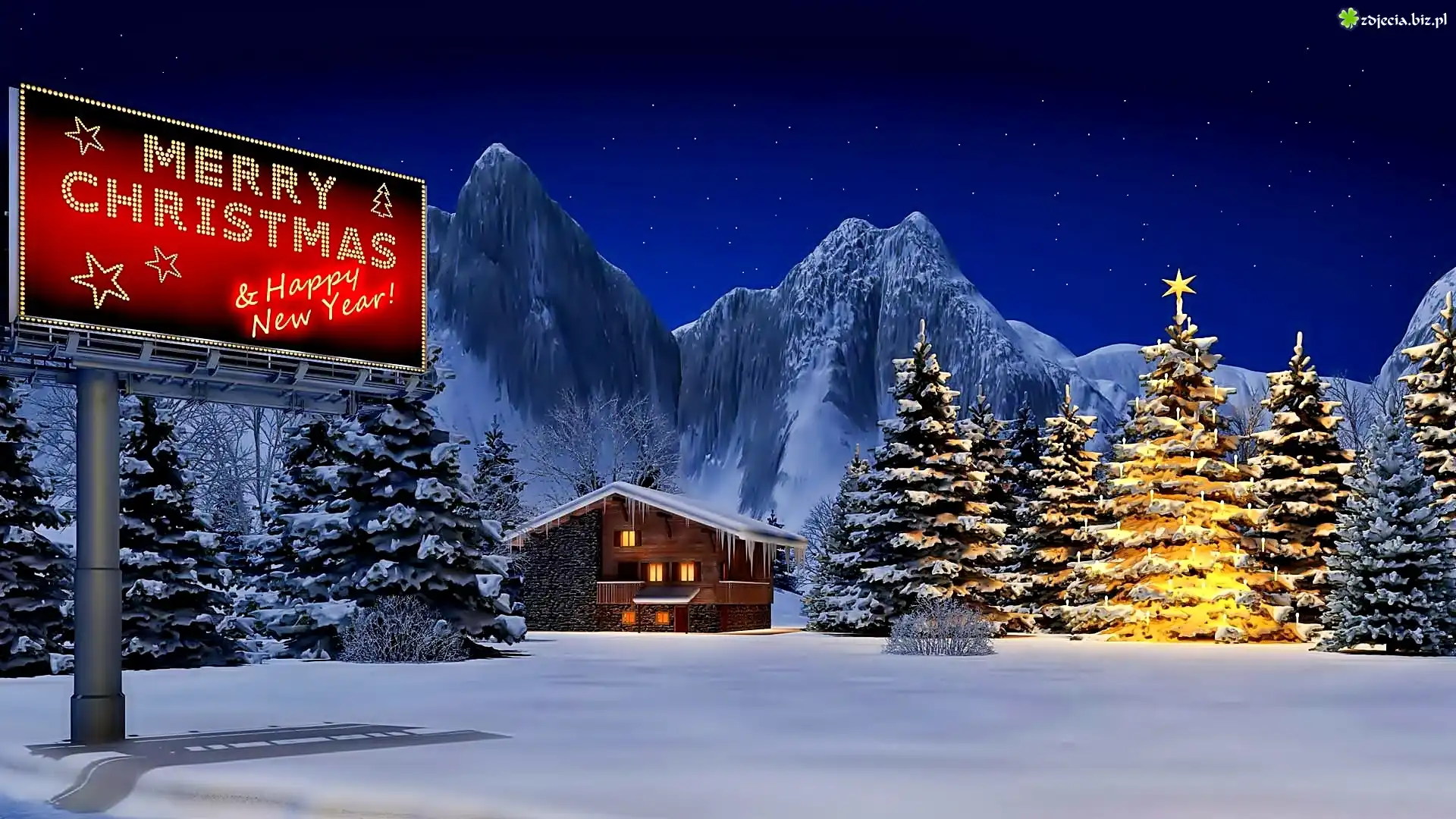 Zdjęcie Zima, Góry, Choinki, Dom, Boże Narodzenie, Święta, Grafika