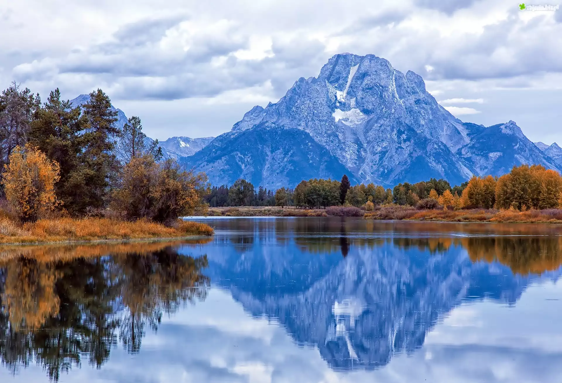 Zdjęcie Stany Zjednoczone, Stan Wyoming, Park Narodowy Grand Teton, Rzeka Snake River, Jesień, Drzewa, Góry, Szczyt Mount Moran |