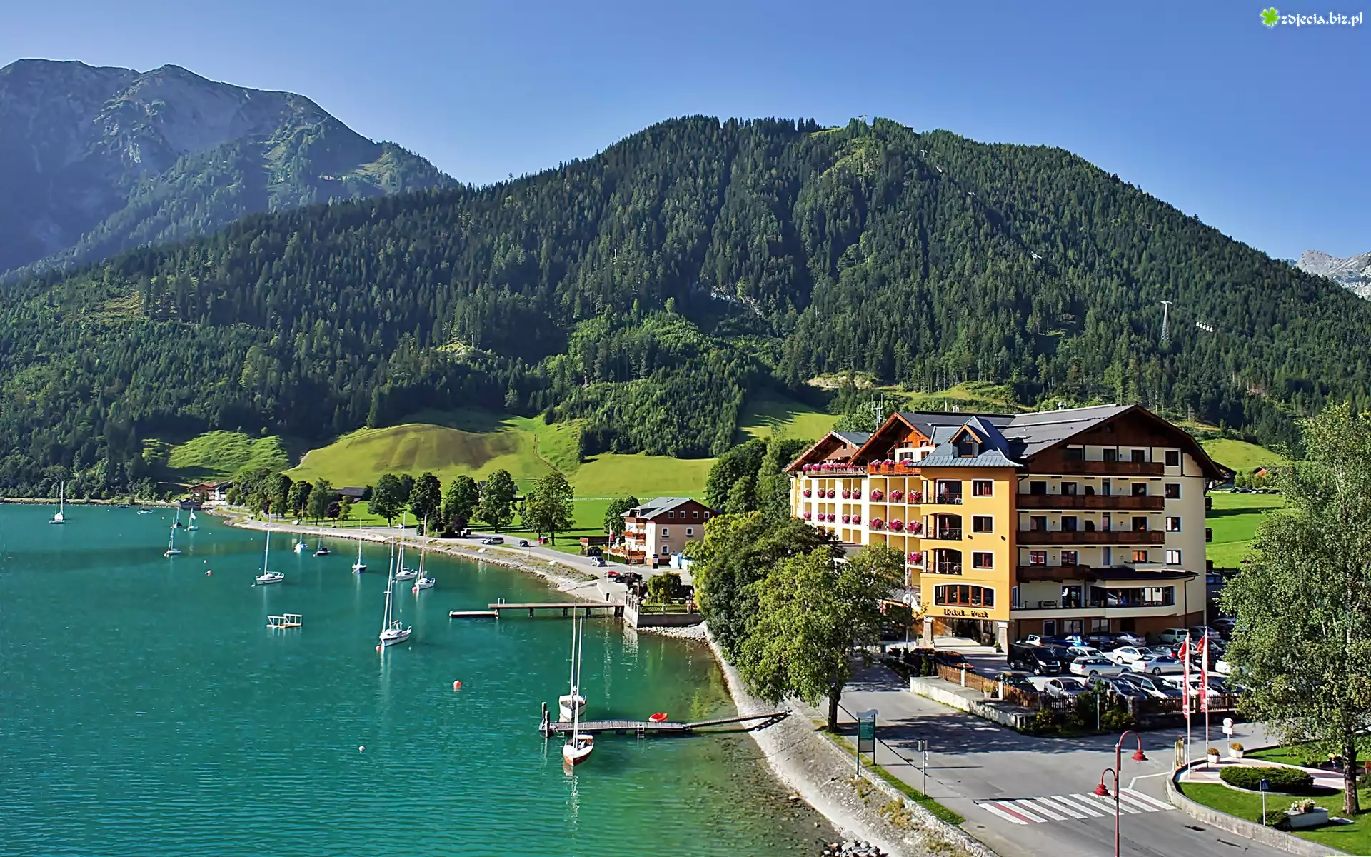 Zdjęcie Tyrol, Góry, Lasy, Pertisau, Hotel, Jezioro, Achensee, Jachty