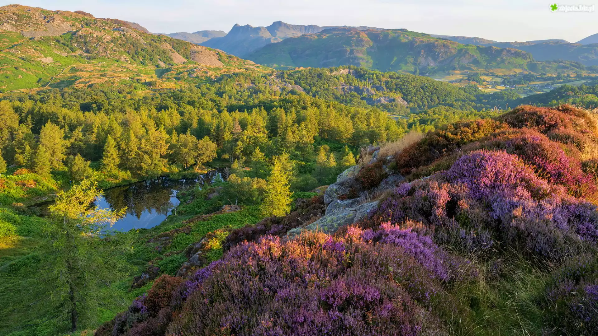 Zdjęcie Góry, Zielone, Lasy, Drzewa, Jezioro, Wrzosowisko