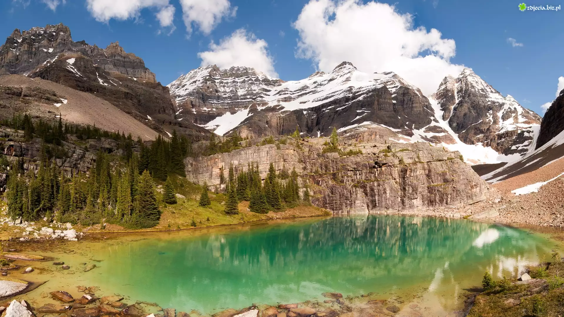Zdjęcie Jezioro, Góry, Drzewa, Białe, Chmury, Niebieskie, Niebo