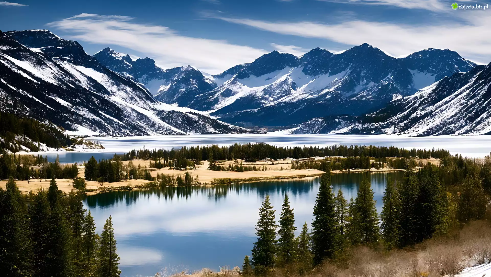 Zdjęcie Austria, Salzburg, Jezioro, Góry, Śnieg, Dolina, Drzewa
