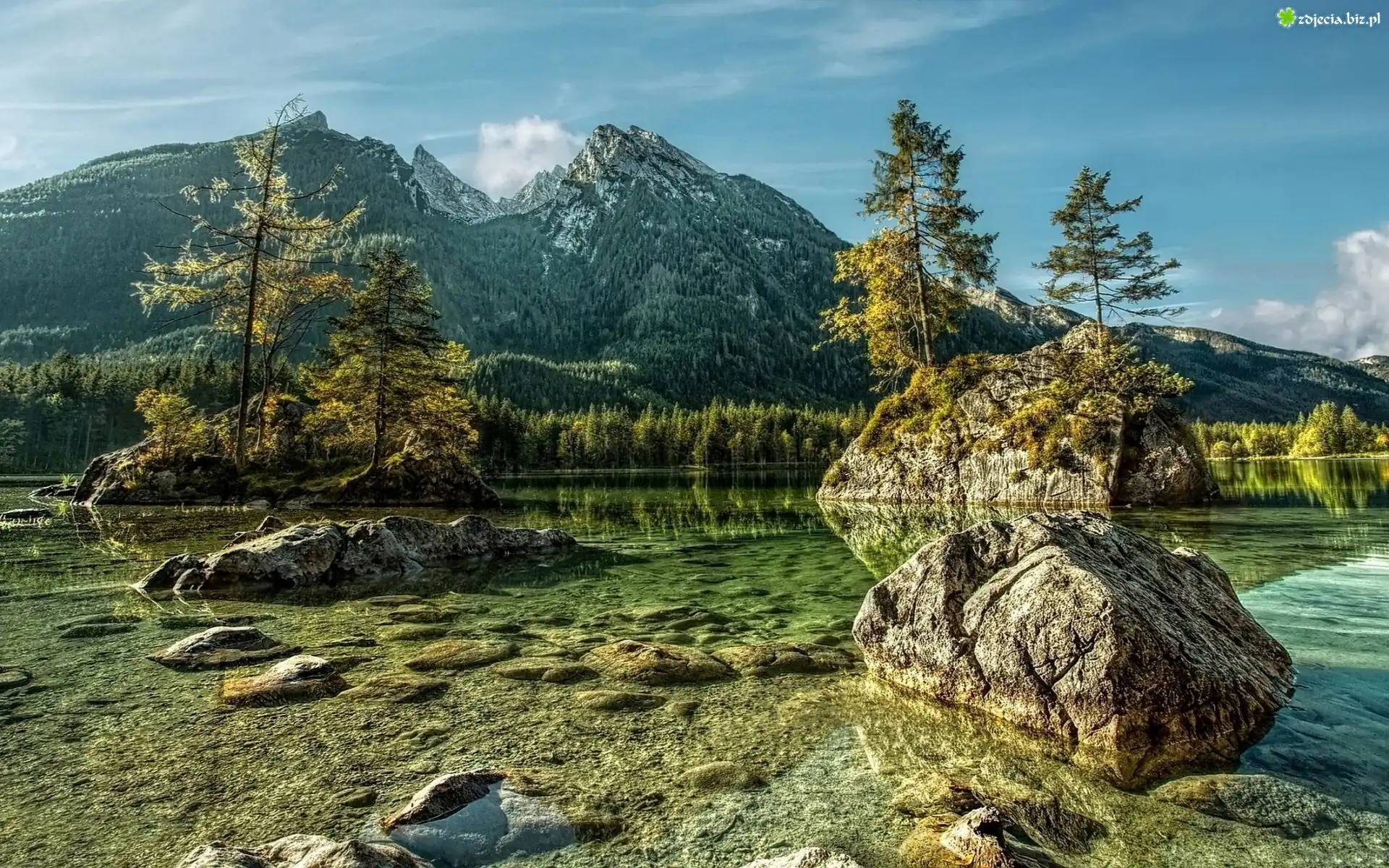 Zdjęcie Góry, Drzewa, Kamienie, Woda