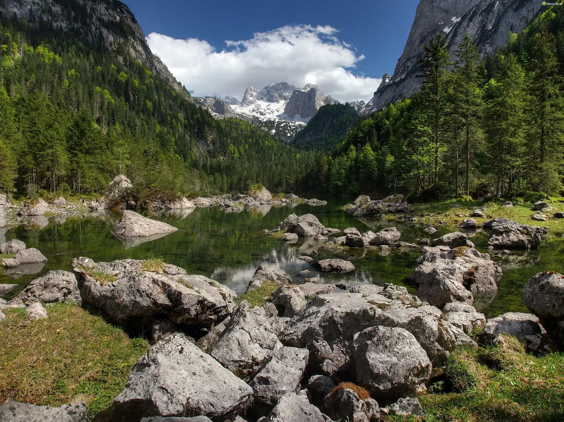 Zdjęcie, Góry, Jezioro, Kamienie, Lasy