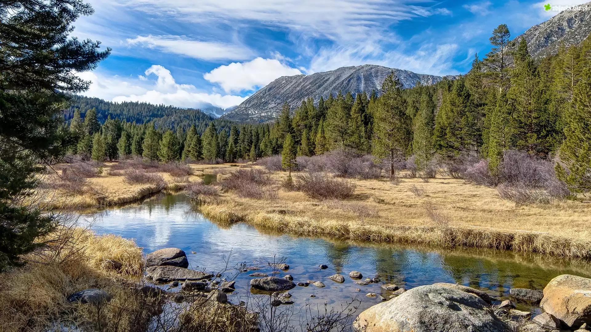 Zdjęcie Góry, Rzeka, Las, Drzewa, Kamienie, Chmury
