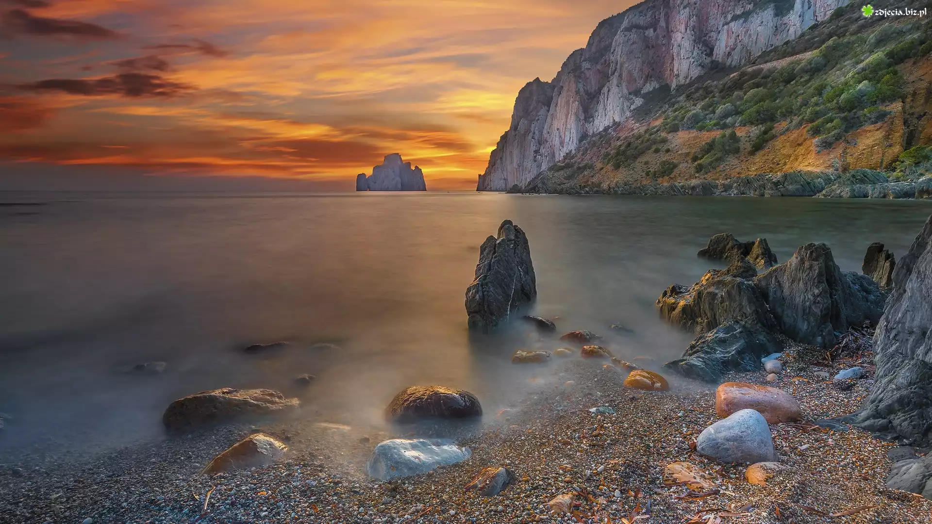 Zdjęcie Zachód słońca, Morze, Góry, Skały, Kamienie