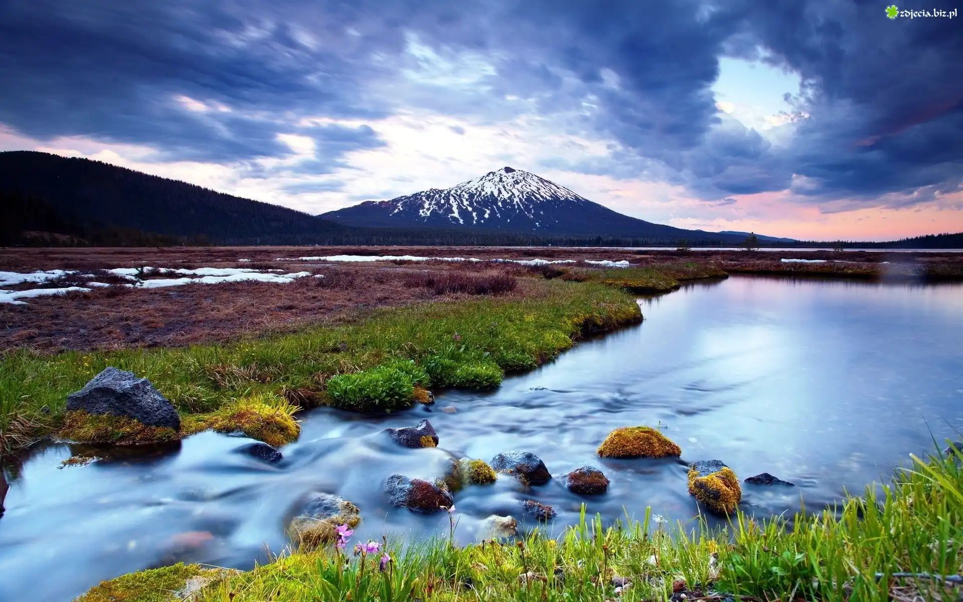 Zdjęcie Góry, Lasy, Zachmurzone, Niebo, Kamienie, Woda