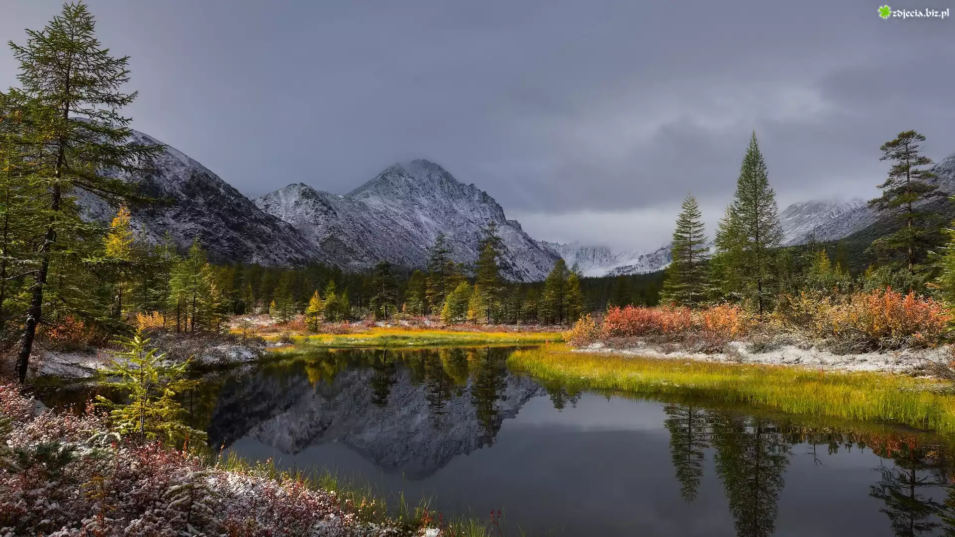 Zdjęcie Góry, Jezioro, Jacka Londona, Drzewa, Jesień, Chmury, Odbicie, Kołyma, Rosja