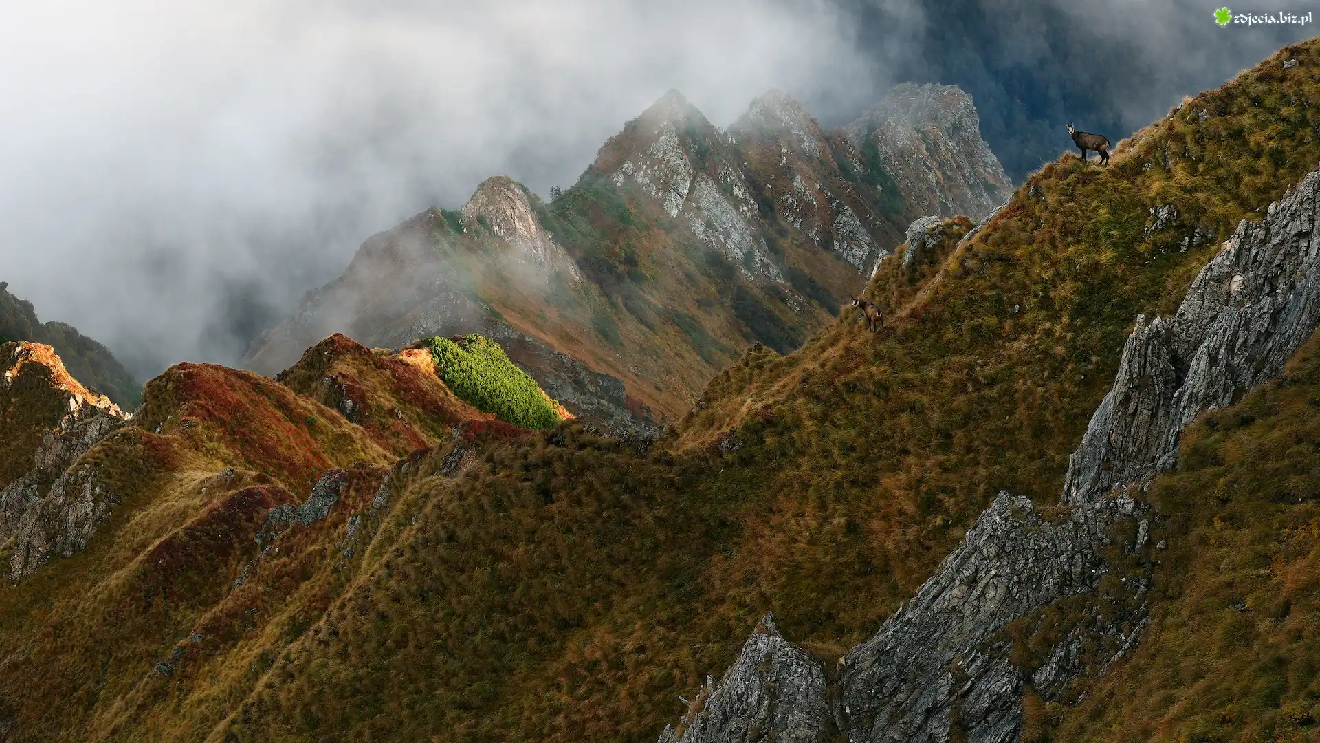 Zdjęcie Góry, Mgła, Skały, Roślinność, Kozy górskie