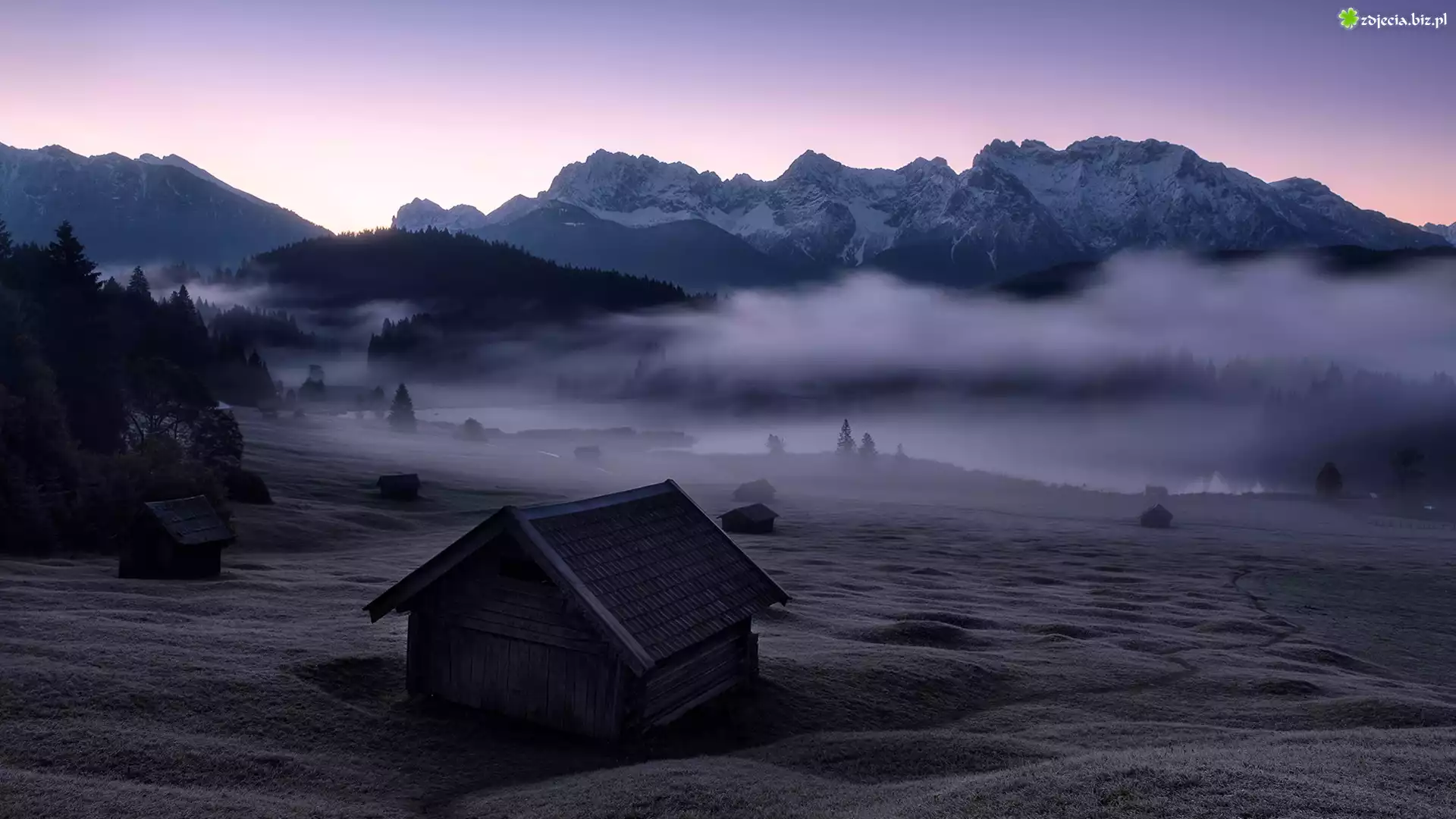 Zdjęcie Góry Karwendel, Miejscowość Krun, Jezioro Geroldsee, Las, Drzewa, Mgła, Drewniany, Dom, Bawaria, Niemcy |