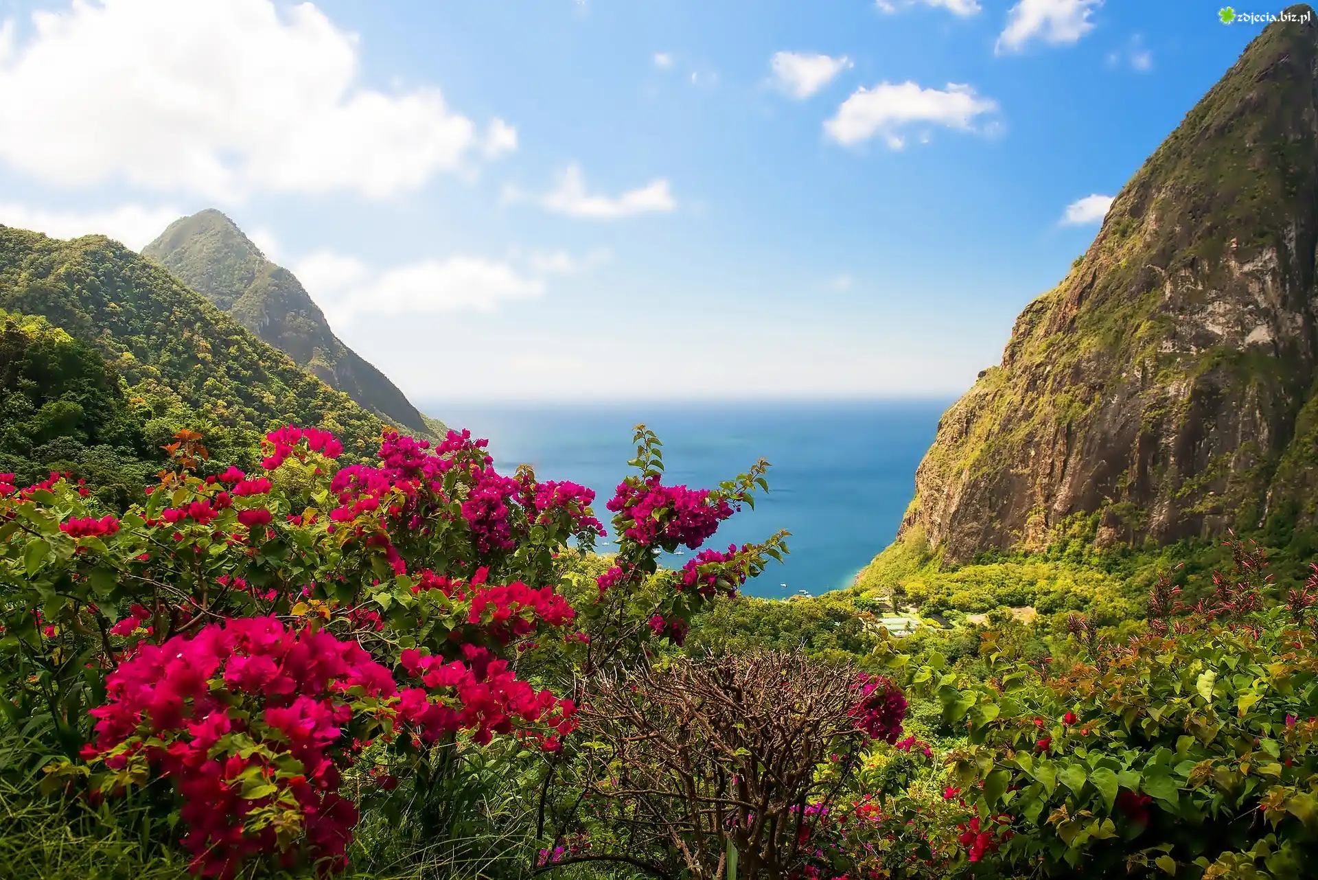 Zdjęcie Góry, Morze, Krzewy, Kwiaty