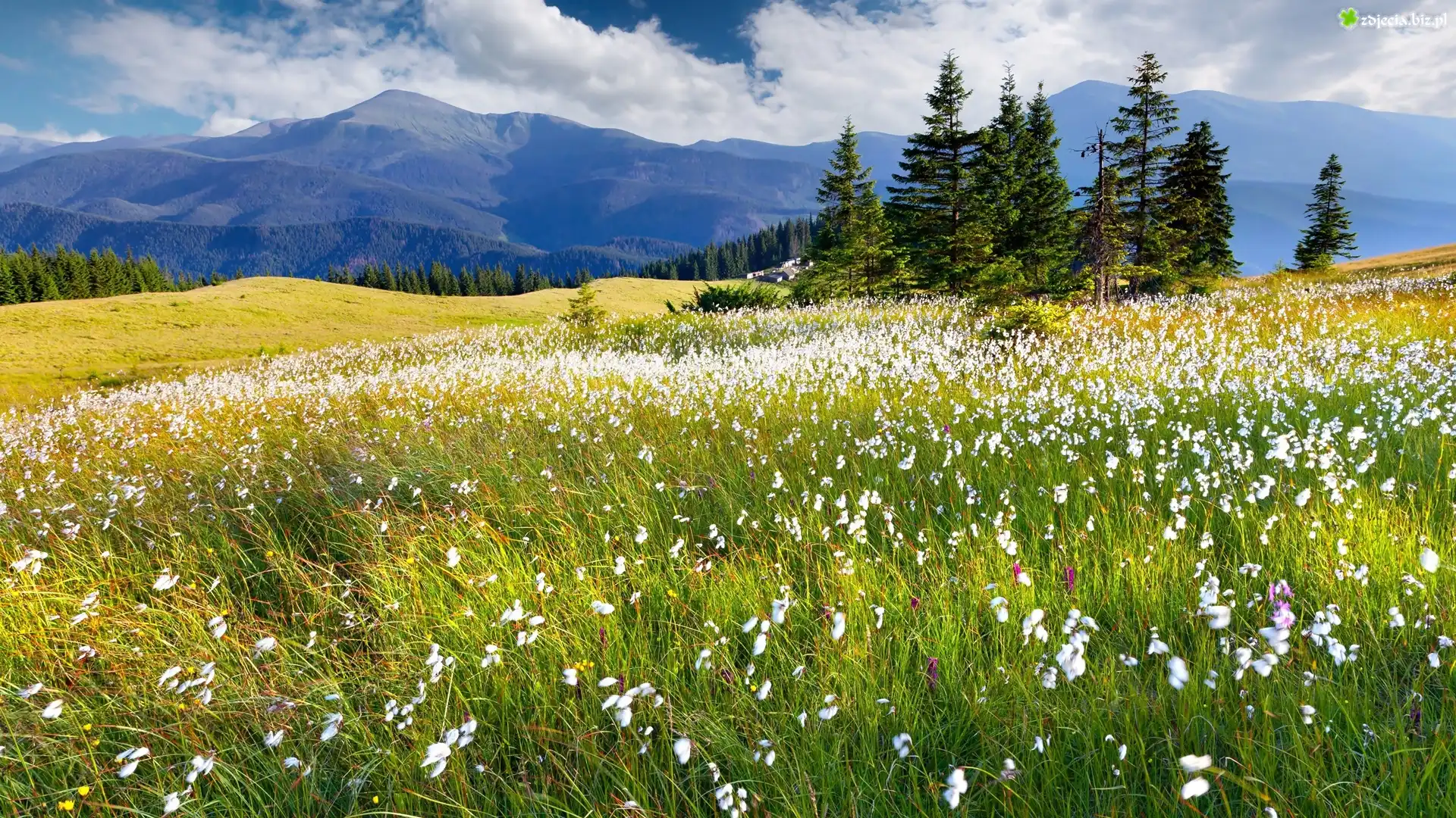 Zdjęcie Góry, Drzewa, Łąka, Kwiaty, Chmury