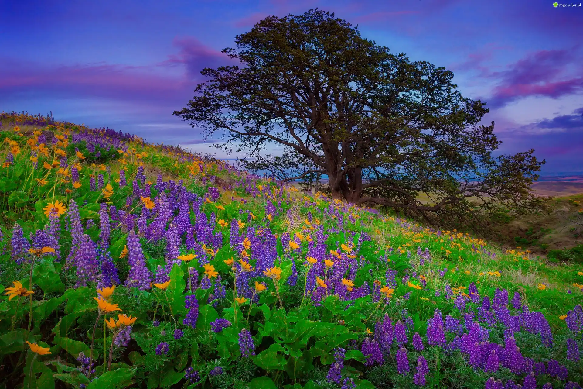 Zdjęcie, Góry, Drzewo, Łąka, Kwiaty, Wiosna
