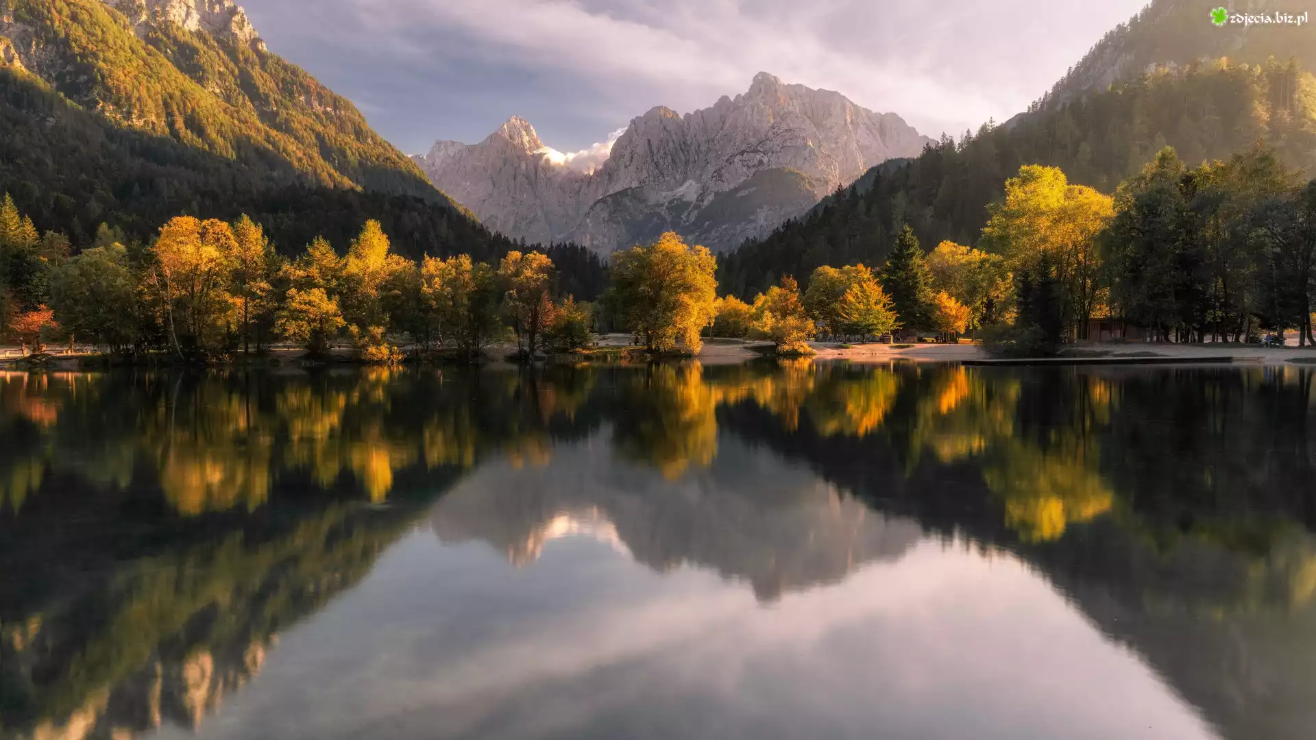 Zdjęcie Słowenia, Kranjska Gora, Góry, Alpy Julijskie, Jezioro, Jasna Lake, Las, Drzewa, Chmury, Odbicie |