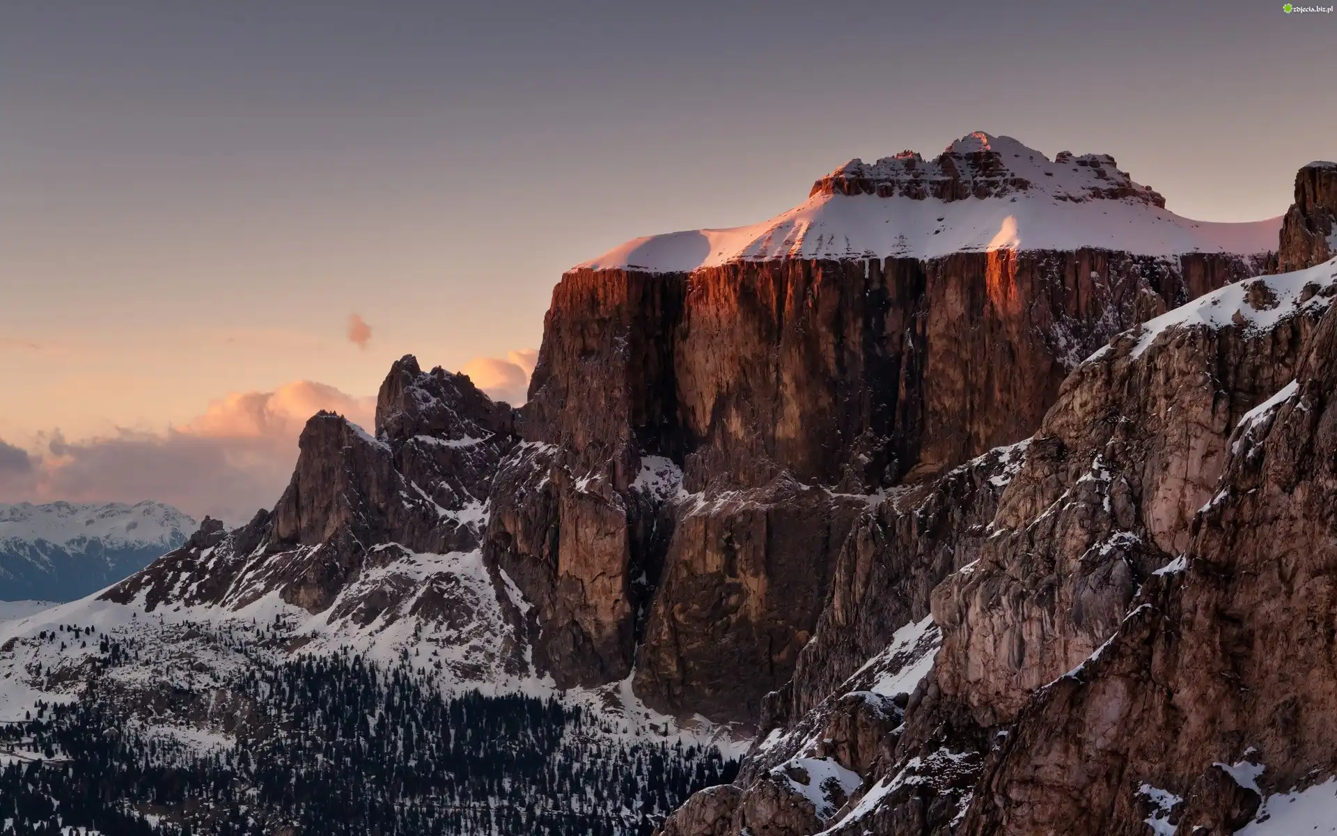 Zdjęcie, Włochy, Prowincja Bolzano, Dolomity, Góry Sassolungo, Niebo, Las, Śnieg