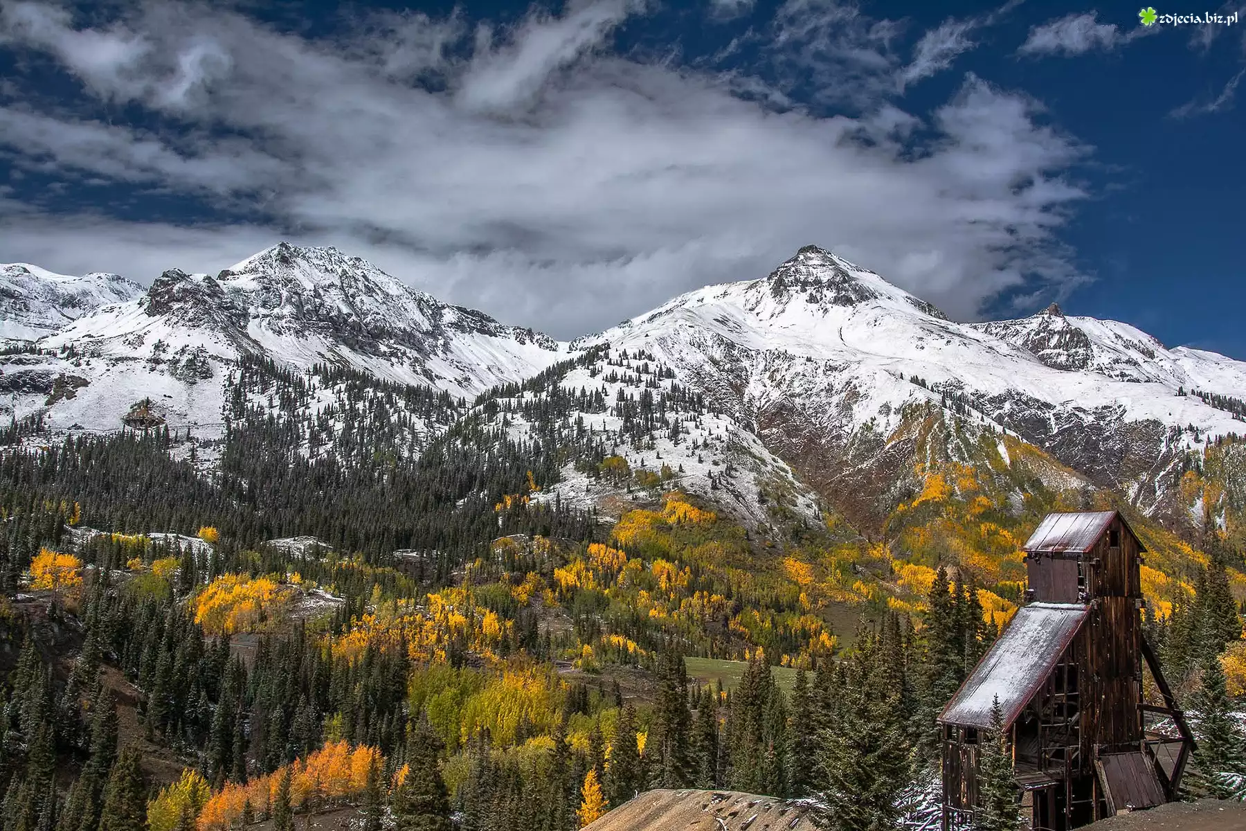 Zdjęcie Góry, Śnieg, Jesień, Lasy, Budowla