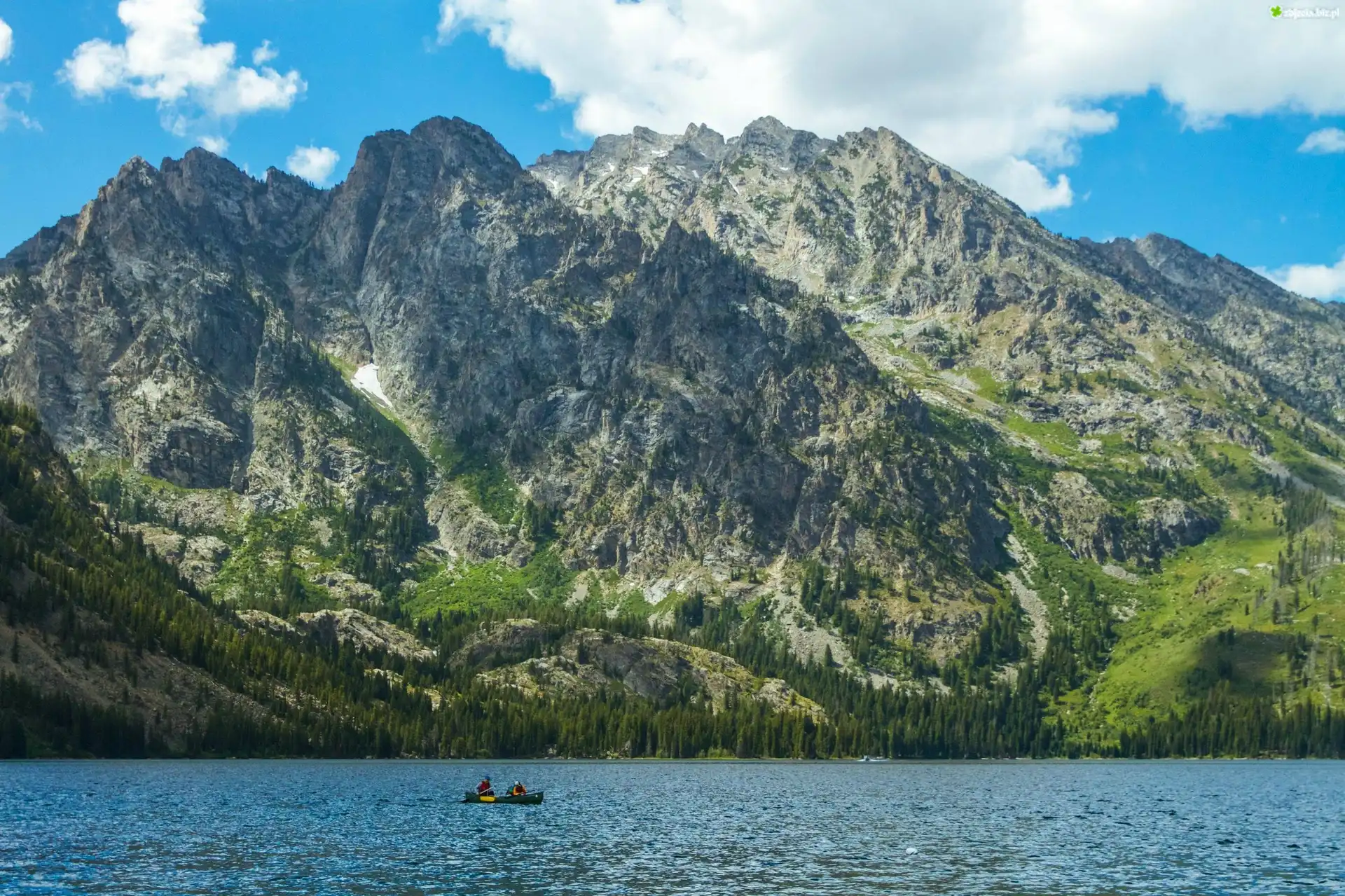 Zdjęcie, Góry, Jezioro, Chmury, Kajak, Ludzie, Drzewa