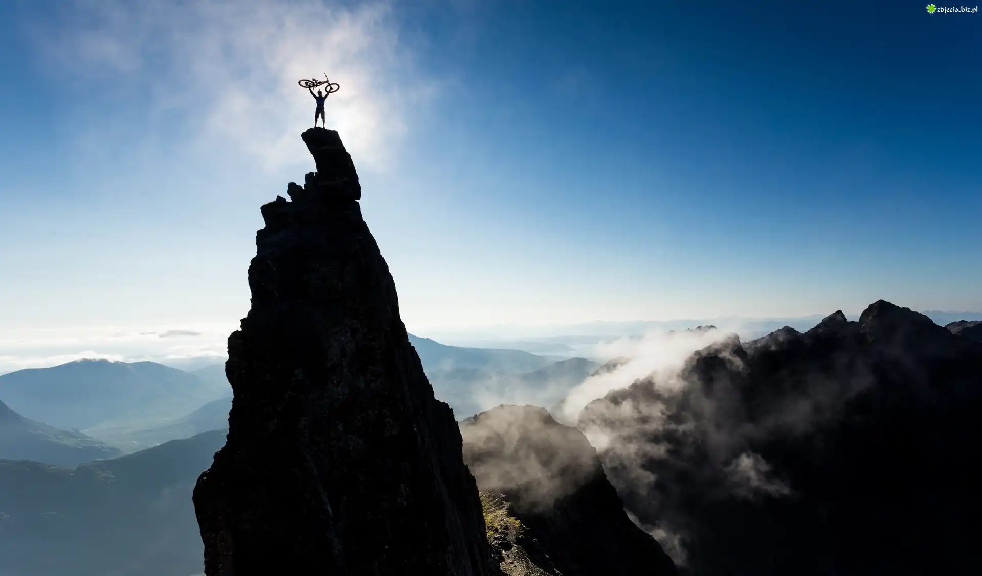 Zdjęcie Góry, Mgła, Mężczyzna, Rower