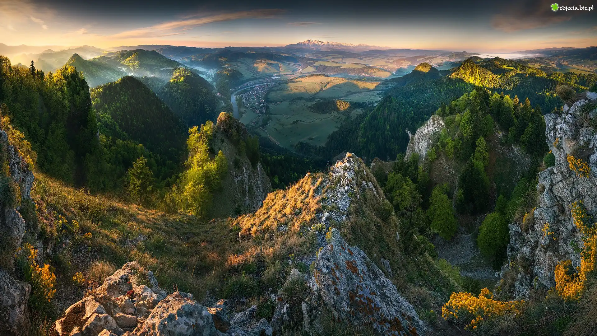 Zdjęcie Wschód słońca, Mgła, Góry, Skały, Trawa, Las