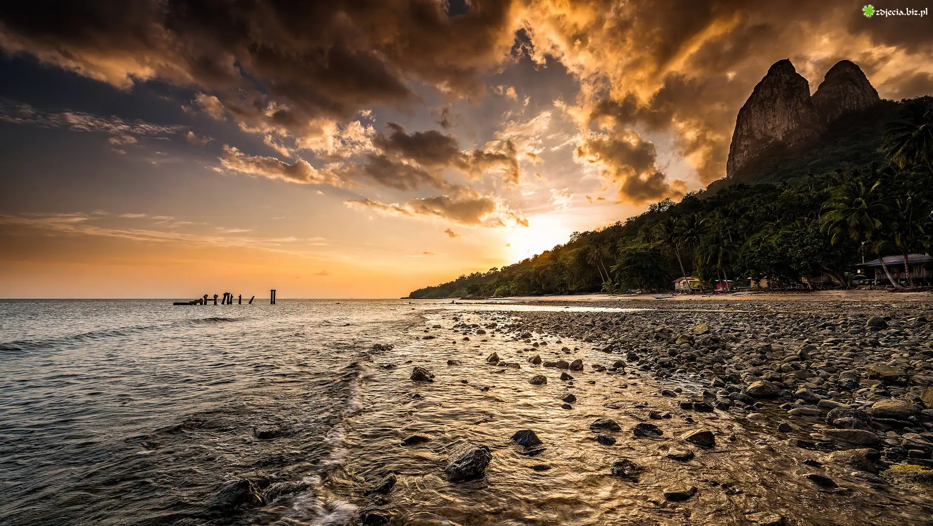 Zdjęcie Morze, Góry, Wschód słońca, Palmy, Plaża, Chmury