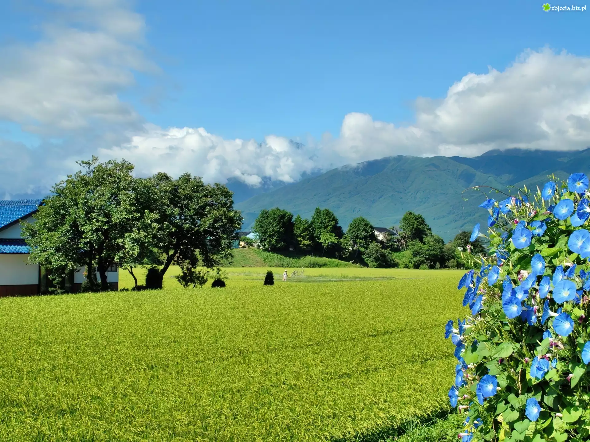 Zdjęcie Góry, Pole, Zboża, Niebieskie, Kwiaty