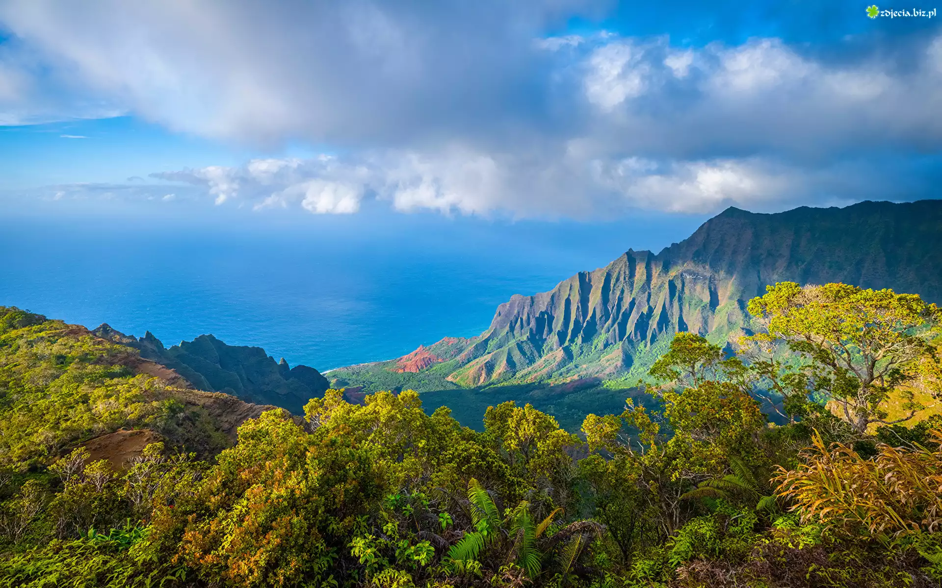 Zdjęcie Stany Zjednoczone, Hawaje, Dolina, Kalalau Valley, Góry, Niebo, Białe, Chmury, Drzewa