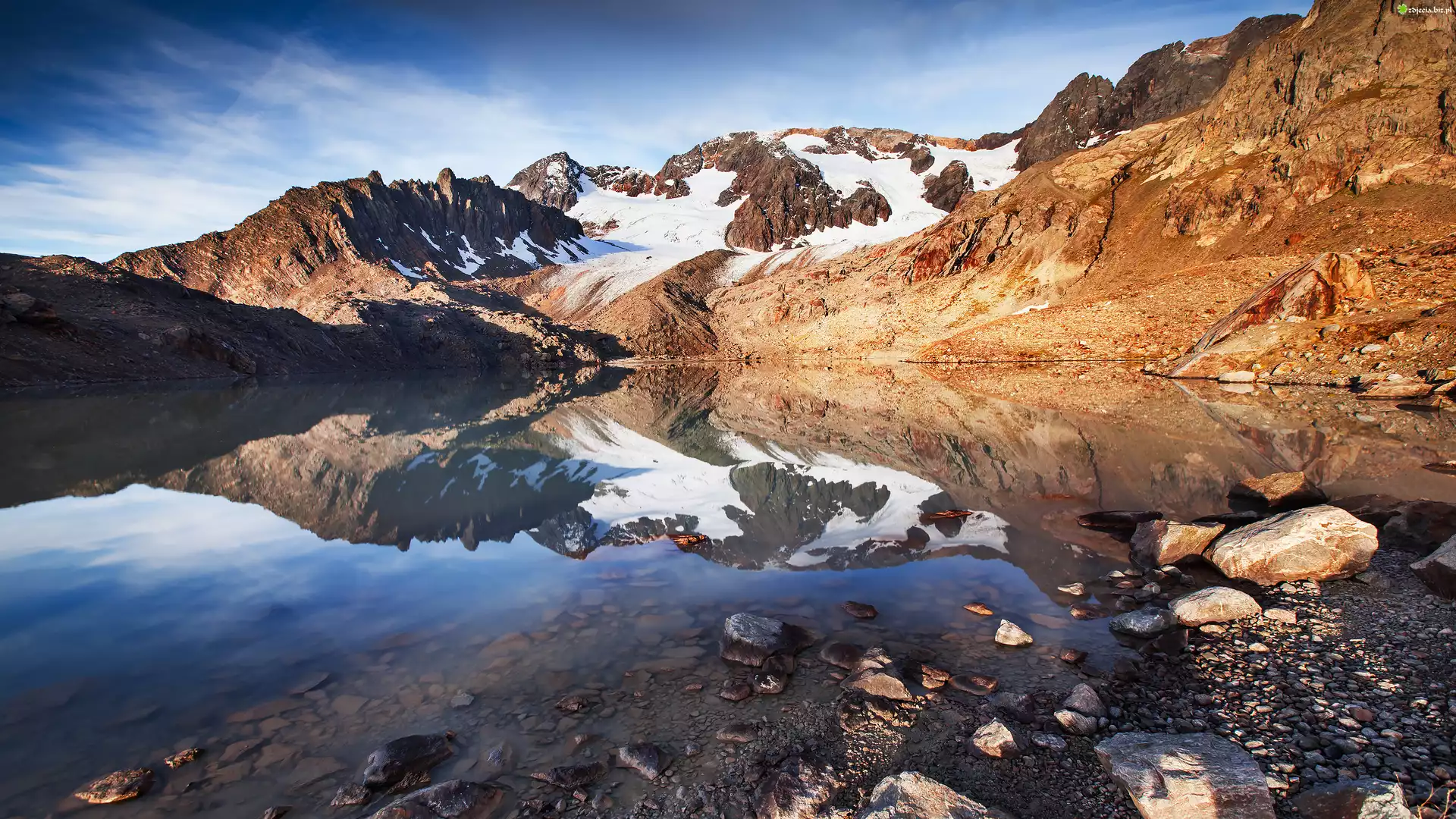 Zdjęcie Niebo, Góry, Śnieg, Skały, Rzeka, Woda, Jezioro